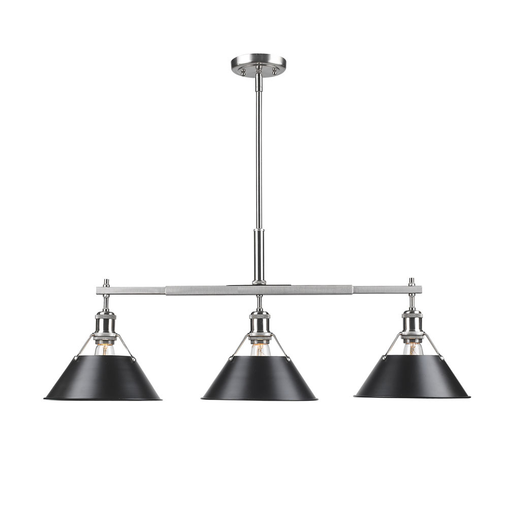 Bring industrial charm into your home with the Yep by Golden Lighting Orwell 3-light Island Light. Featuring a metal shade and a pewter frame, it sets a warm and welcoming foundation for your space. Its metal shade in matte black offers a deep, uniform color with a non-reflective matte sheen, expertly capturing light for a soft ambiance that complements any decor. The pewter finish introduces timeless sophistication with medium-grey tones that effortlessly diffuse light, casting a gentle, non-glare glow throughout the room. Tailored for kitchen islands, this fixture is dry location rated for indoor use and is easily installed on sloped ceilings with adjustable height from 17.125" to 59.125". It requires 3 E26 medium base bulbs (not included), ensuring ample lighting wherever it’s placed. With overall dimensions of 35.75"W x 14.5"H x 10"D, it merges utility and aesthetics seamlessly. Transform your culinary space with an exquisite mix of style and practicality, embodying quality and flair.