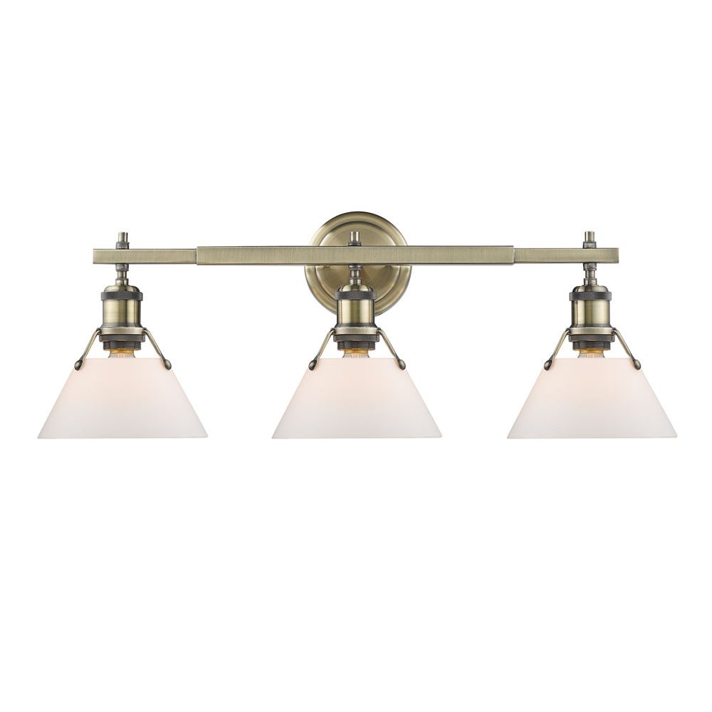 Bring industrial elegance into your home with the Yep by Golden Lighting Orwell 3-light Vanity in Aged Brass and Opal Glass. Featuring an opal glass shade and a sophisticated aged brass frame, it creates a welcoming atmosphere in any space. The opal glass shade is designed to diffuse light evenly, offering a soft, glare-free glow that enhances the ambiance. Its classic, milky white surface is both timeless and elegant, perfect for any decor style. Embrace timeless elegance with our Aged Brass finish that creates a warm and inviting glow, adding depth and character to traditional, transitional, or industrial-inspired spaces. Ideal for brightening bathrooms or other covered spaces, it's rated for damp locations and fits seamlessly into areas with occasional moisture. Requires 3 E26 Medium base bulbs (not included), with dimensions of 27.25"W x 9.88"H x 8.5"D. Elevate your decor with a stylish, functional light fixture that combines quality with aesthetic appeal.