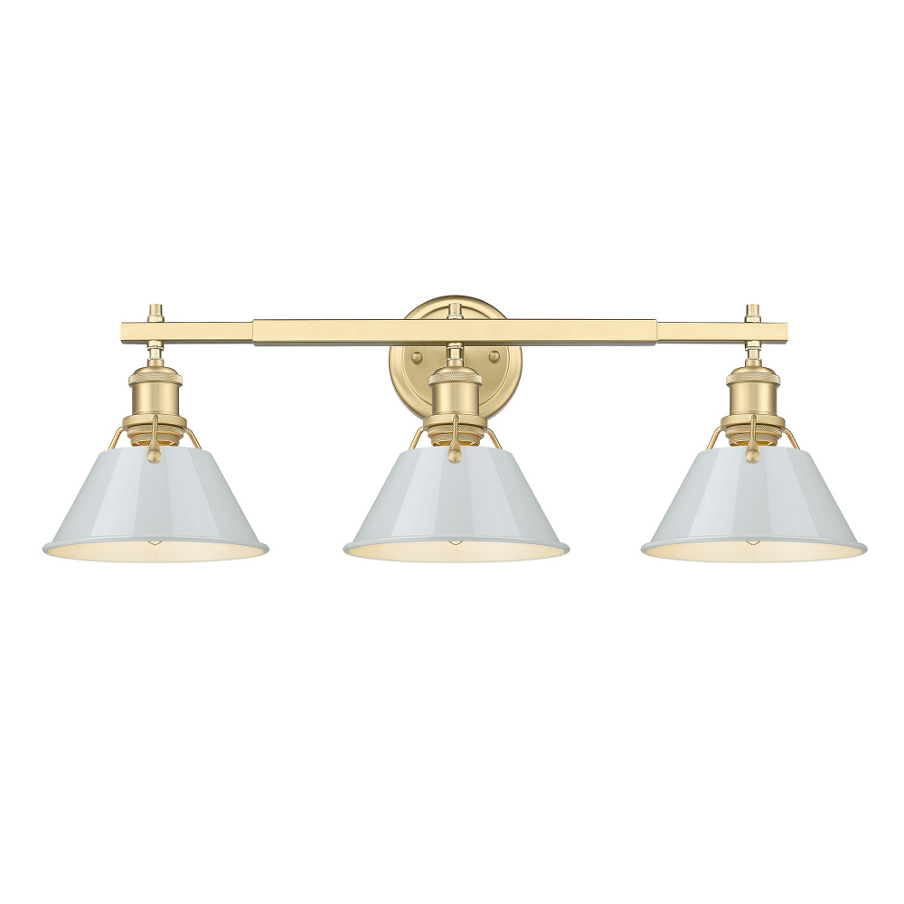 Bring industrial elegance into your home with the Yep by Golden Lighting Orwell 3-light Vanity. Featuring a metal shade and a brushed champagne brass frame, it creates a welcoming atmosphere. The metal shade in a dusky blue finish adds a serene touch while providing a smooth, high-gloss sheen that enhances the light effect. Our brushed champagne brass finish offers understated elegance with its soft satin sheen, perfect for adding contemporary style to your space. Ideal for bathrooms, this fixture is damp location rated, making it suitable for areas with occasional moisture. Requires no additional install details, simply mount and enjoy. Requires 3 E26 Medium base bulbs (not included) with a maximum wattage of 100 per bulb. Overall dimensions are 27.25"W x 9.88"H x 8.5"D for a beautiful fit in any space. Illuminate your bathroom with a luxurious touch and quality craftsmanship from Yep by Golden Lighting.