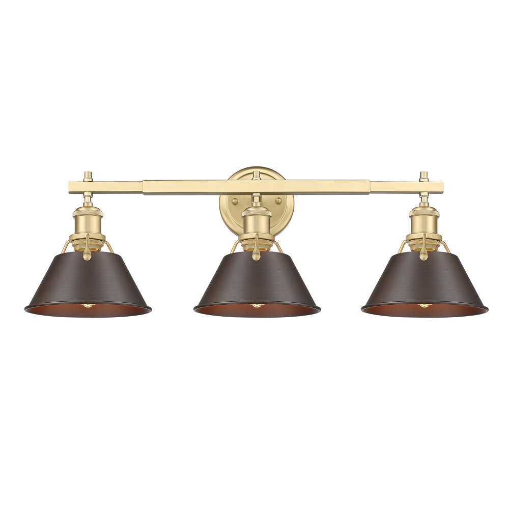 Transform your bathroom with the Yep by Golden Lighting Orwell 3-light Vanity. This fixture showcases a luxurious rubbed bronze shade paired with a brushed champagne brass frame, delivering a unique blend of charm and modernity. The rubbed bronze shade features a rich, dark brown color that beautifully diffuses light, providing a warm and inviting glow for any space. Rated for damp locations, this fixture is suitable for areas with occasional moisture, making it an ideal lighting choice for bathrooms, covered porches, and laundry rooms. It requires three E26 medium base bulbs (not included), with a maximum wattage of 100 per bulb. The dimensions are 27.25"W x 9.88"H x 8.5"D, making it perfect for various bathroom designs. Enrich your home with this stylish yet practical light fixture that elevates both function and aesthetics.
