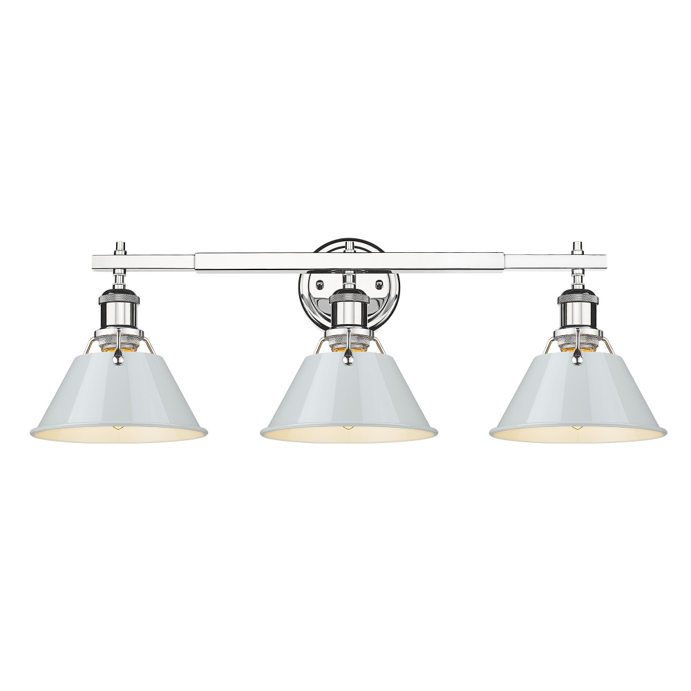 Bring industrial elegance into your home with the Yep by Golden Lighting Orwell 3-light Vanity in Chrome and Dusky Blue shade. Featuring a dusky blue shade and a polished chrome frame, it creates a welcoming atmosphere. The dusky blue shade introduces a serene touch of color while effectively diffusing the light, making it perfect for a relaxing bathroom environment. This brilliant and timeless Polished Chrome finish provides a crisp, clean aesthetic that elevates any space. Its highly reflective surface seamlessly integrates into various decor styles—from ultra-modern to classic traditional. Ideal for enclosed spaces, this vanity light is damp location rated, making it suitable for bathrooms, covered porches, and laundry rooms. Requires 3 E26 Medium base bulbs (not included), max wattage of 100 per bulb. Overall dimensions are 27.25"W x 9.88"H x 8.5"D. Enhance your home with this quality fixture that combines style and practicality.