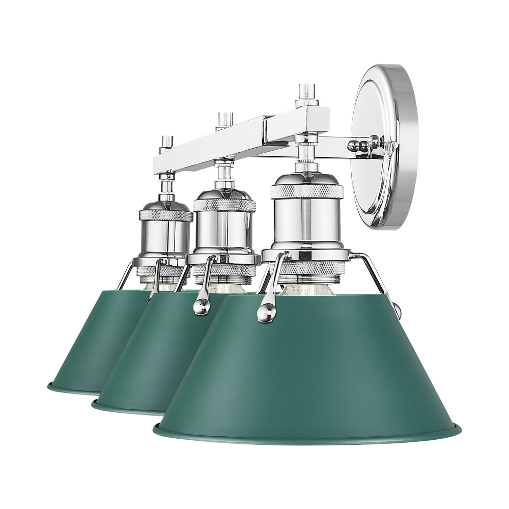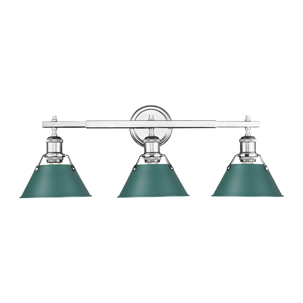 Bring industrial elegance into your home with the Yep by Golden Lighting Orwell 3-light Vanity. Featuring a metal shade and a chrome frame, it creates a welcoming atmosphere. The pine green metal shade boasts a velvety matte finish, absorbing light and imparting a rich, saturated color. Brilliant and timeless, the polished chrome finish offers a crisp, clean look that easily integrates into diverse decor styles. Ideal for brightening bathrooms, this light provides flattering and practical task illumination. Rated for damp locations, it is suitable for covered and semi-enclosed spaces like bathrooms and laundry rooms. Requires 3 E26 Medium base bulbs (not included), each with a maximum wattage of 100, ensuring plenty of light for all your grooming needs. With overall dimensions of 27.25"W x 9.88"H x 8.5"D, this light fixture complements your vanity perfectly. Upgrade your bathroom with a blend of style and function.