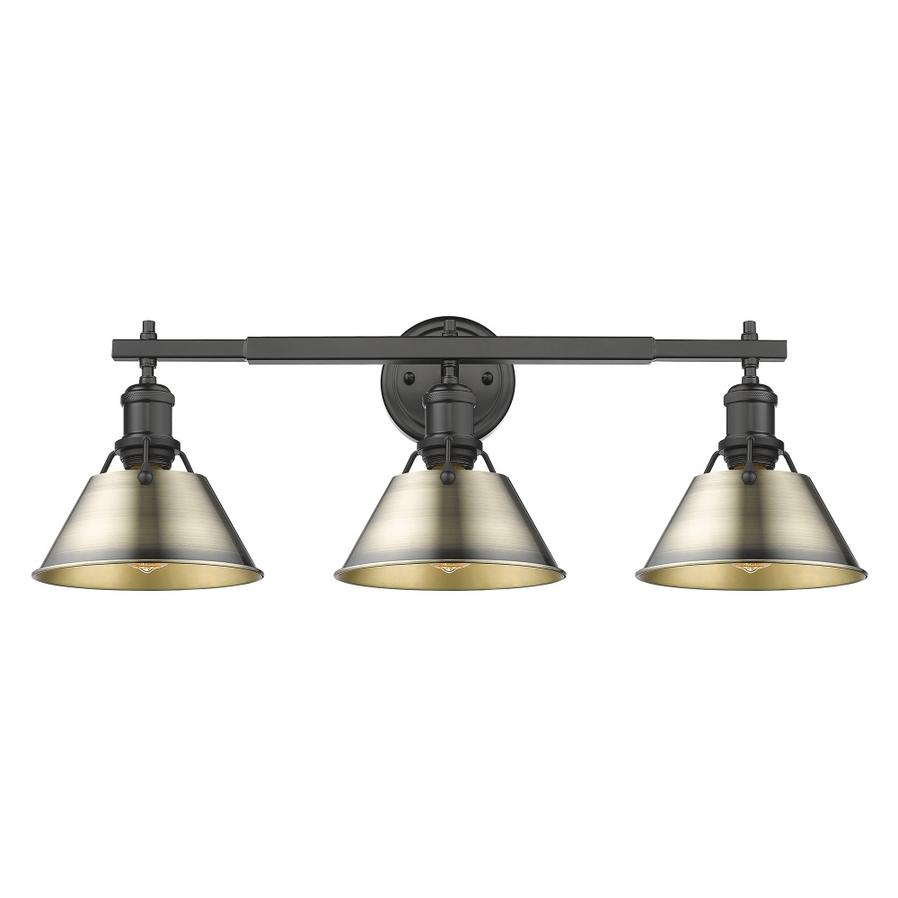 Bring industrial elegance into your home with the Yep by Golden Lighting Orwell 3-light Vanity. Featuring a Metal shade and a Matte Black frame, it creates a welcoming atmosphere. The Metal shade reflects a warm, antiqued glow with its Aged Brass finish, distinguished by a fine, circular brushed texture that adds visual depth and character. The epitome of clean, modern style, the Matte Black finish offers a smooth, non-reflective surface that absorbs light, making it an ideal complement to various decors. Suitable for damp locations like bathrooms and covered porches, this light fixture is perfect for providing practical task illumination. Requires 3 E26 Medium base bulbs (not included), with a maximum wattage of 100 per bulb. Overall dimensions are 27.25"W x 9.88"H x 8.5"D. Elevate your bathroom with this lighting solution that combines style and functionality.