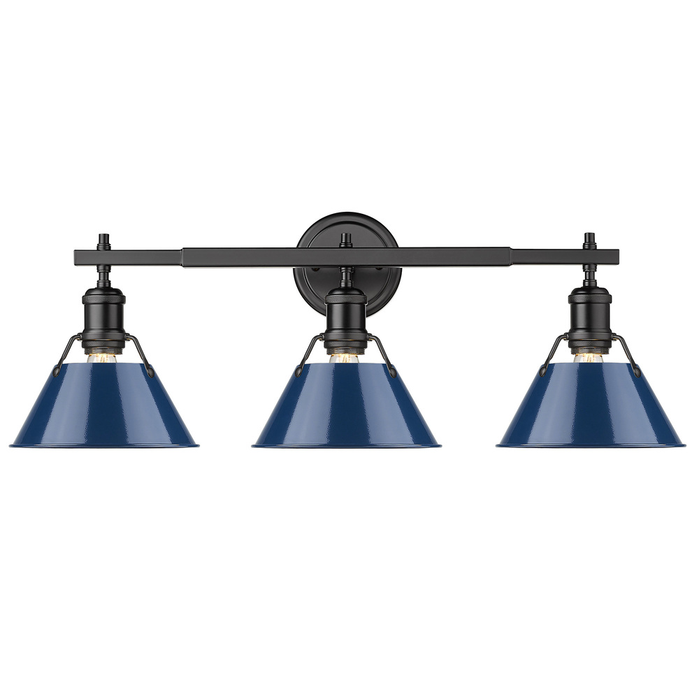 Bring industrial elegance into your home with the Yep by Golden Lighting Orwell 3-light Vanity. Featuring a metal shade and a matte black frame, it creates a welcoming atmosphere. The navy blue metal shade not only adds a classic touch but also reflects light beautifully, giving your bathroom a sophisticated edge. With its matte black finish, this vanity light offers timeless versatility that suits any modern or traditional décor. Perfect for brightening bathrooms, the fixture is damp location rated—ideal for spaces with occasional moisture. Requires installation but is suitable for covered areas like bathrooms or laundry rooms. Overall dimensions are 27.25"W x 9.88"H x 8.5"D, and it requires 3 E26 medium base bulbs (not included), with a maximum wattage of 100 per bulb. Elevate your space with the striking design and high-quality craftsmanship of this distinctive fixture.