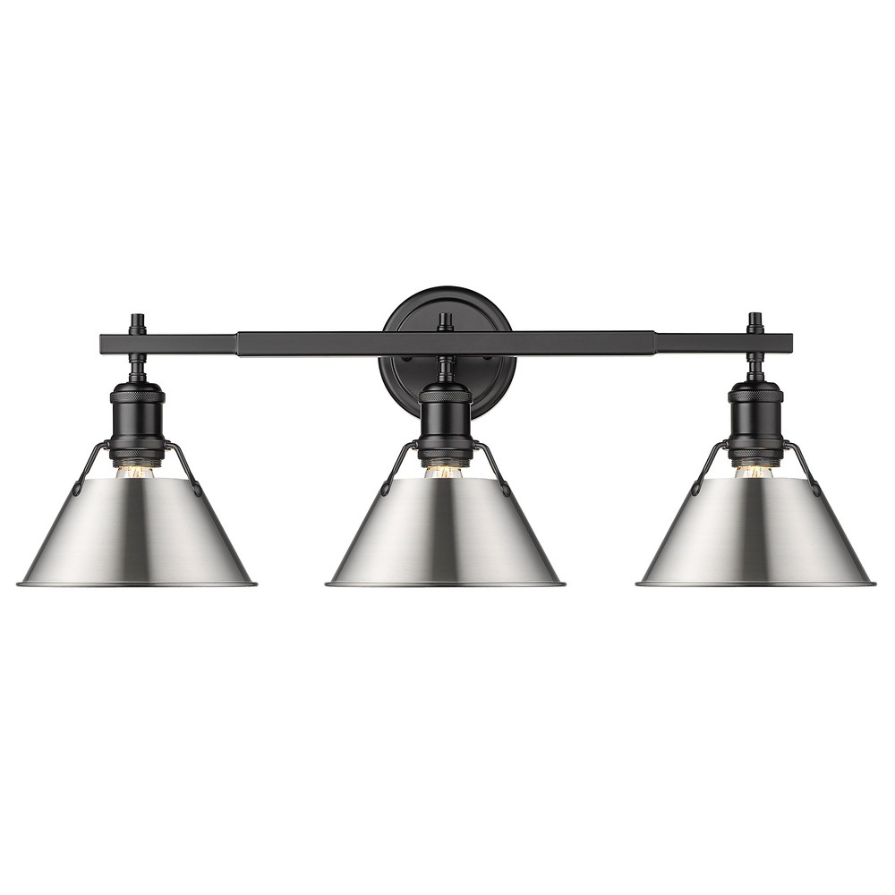 Bring industrial elegance into your home with the Yep by Golden Lighting Orwell 3-light Vanity in Matte Black and Pewter. Featuring a pewter shade and a matte black frame, it creates a welcoming atmosphere. The pewter metal shade gently diffuses light, providing an elegant, non-glare glow that enhances any space. Its timeless and classic appeal ensures it complements various decor styles. Ideal for covered and semi-enclosed spaces, this fixture is perfect for bathrooms, covered porches, and laundry rooms. Requires three E26 Medium base bulbs, with a maximum wattage of 100 per bulb, and measures 27.25"W x 9.88"H x 8.5"D, making it a versatile choice for your vanity lighting needs. Elevate your space with high-quality craftsmanship and modern style.