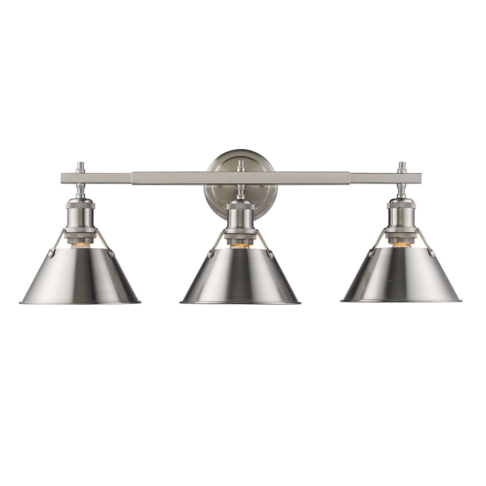 Bring industrial elegance into your home with the Yep by Golden Lighting Orwell 3-light Vanity. Featuring a metal shade and a pewter frame, it creates a welcoming atmosphere. This light boasts a pewter electroplated finish with a medium-toned, warm silver-grey color and a satin lustre that diffuses light softly, providing a non-glare glow. Ideal for adding a touch of traditional charm to both classic and contemporary spaces, this vanity light is damp location rated, making it suitable for covered and semi-enclosed spaces like bathrooms and laundry rooms. Requires three E26 medium base bulbs (not included), with a maximum wattage of 100 per bulb. Overall dimensions are 27.25"W x 9.88"H x 8.5"D, making it perfect for spaces needing practical task lighting while enhancing your decor.