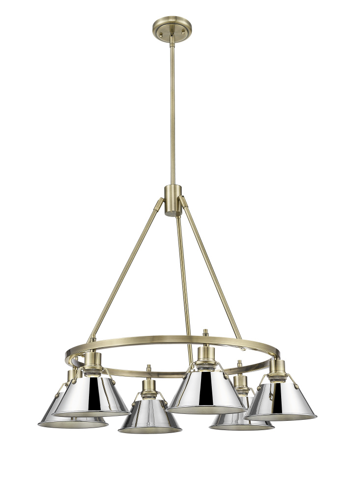 Bring industrial charm into your home with the Yep by Golden Lighting Orwell 6-light Chandelier. Featuring a chrome shade and an Aged Brass frame, it creates a striking ambiance. The chrome shade showcases a polished finish providing a bright, reflective surface that enhances the lighting effect. This mirror-like sheen complements diverse décor styles. Embrace the quality of the Aged Brass finish, which exudes warmth and a sense of history, making it suitable for a variety of spaces including transitional and industrial-inspired environments. Ideal for dining rooms and foyers, this chandelier is dry location rated for indoor areas not subject to moisture. It offers sloped-ceiling compatibility and is adjustable in height from 21.25" to 63.25". With overall dimensions of 29"W x 20.38"H x 29"D, it requires 6 E26 Medium base bulbs (not included), with a maximum of 60 watts per bulb. Elevate your home with this captivating chandelier that masterfully blends elegance and functionality.