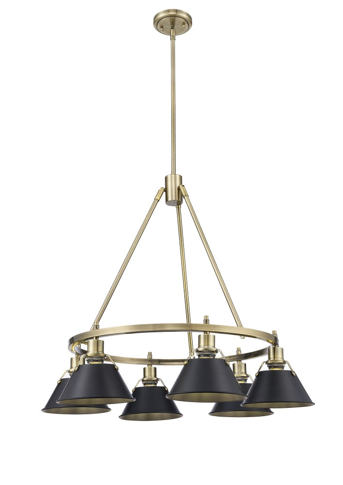 Bring industrial elegance into your home with the Yep by Golden Lighting Orwell 6-light Chandelier. Featuring a metal shade and an Aged Brass frame, it creates a welcoming atmosphere. The metal shade brings a classic, matte black finish that offers a clean, modern style. Its non-reflective surface absorbs light, creating a soft and sophisticated look. Embrace timeless elegance with the Aged Brass finish, which provides a warm glow reminiscent of vintage heirlooms, making it ideal for transitional and industrial-inspired spaces. This chandelier is perfect for dining rooms and foyers, and it is dry location rated for indoor use not subject to moisture. It is sloped-ceiling compatible and adjustable in height, measuring from 21.25" to 63.25". Overall dimensions are 29"W x 20.38"H x 29"D, and it requires 6 E26 Medium base bulbs (not included), with a maximum wattage of 60 per bulb. Elevate your home décor with this striking chandelier that blends style and quality flawlessly.