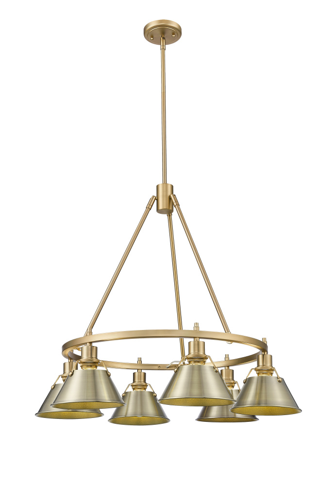 Bring industrial elegance into your home with the Yep by Golden Lighting Orwell 6-light Chandelier. Featuring a metal shade and a Brushed Champagne Brass frame, it creates a welcoming atmosphere. The metal shade beautifully diffuses light, enhancing your space with a warm glow. Its Aged Brass finish is characterized by a fine, circular brushed texture that adds visual depth, while the soft satin sheen elegantly catches the light. This chandelier is perfect for dining rooms and foyers, rated for dry locations, and easily installs on sloped ceilings with its adjustable height from 21.25" to 63.25". Overall Dimensions: 29"W x 20.38"H x 29"D. Requires 6 E26 Medium base bulbs (not included, max 60 wattage per bulb). Elevate your home decor with this versatile and stylish chandelier that promises quality and ambiance.