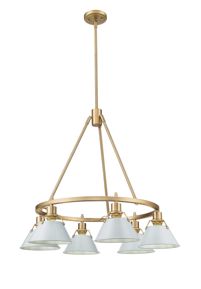 Bring industrial elegance into your home with the Yep by Golden Lighting Orwell 6-light Chandelier. Featuring a metal shade and a Brushed Champagne Brass frame, it creates a welcoming atmosphere. The metal shade beautifully diffuses light, showcasing a Dusky Blue finish that offers a serene touch of color, reminiscent of vintage enamelware. The Brushed Champagne Brass finish is a sophisticated alternative to traditional gold, perfectly blending warmth with sleek elegance. Its refined texture catches the light, making it ideal for adding quiet luxury to any space. Perfect for dining rooms, foyers, or living spaces, this chandelier is dry location rated for indoor use. It is also sloped-ceiling compatible and has an adjustable height feature ranging from 21.25" to 63.25", allowing customization to suit your needs. Overall dimensions are 29"W x 20.38"H x 29"D. The chandelier requires 6 E26 Medium base bulbs (not included), with a maximum wattage of 60 per bulb. Elevate your interior with this striking piece that embodies quality and style.