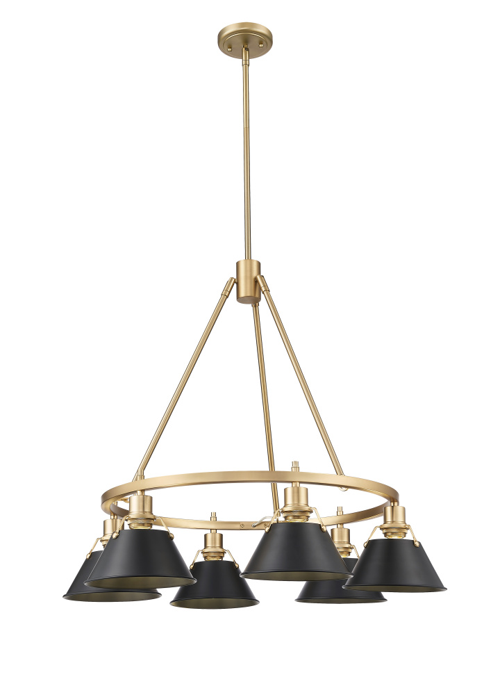 Bring industrial elegance into your home with the Yep by Golden Lighting Orwell 6-light Chandelier. Featuring a metal shade and a brushed champagne brass frame, it creates a welcoming atmosphere. The metal shade beautifully complements the space, catching light while maintaining a timeless aesthetic. Its matte black finish enhances the clean, modern style, providing a sophisticated look that's both stylish and versatile. The brushed champagne brass finish offers a refined texture and soft satin sheen, making it perfect for adding luxury to your decor. Ideal for dry locations, this chandelier is perfect for bedrooms, living rooms, or hallways. It's also sloped-ceiling compatible and features an adjustable height ranging from 21.25" to 63.25" for customizable installation. Overall Dimensions: 29"W x 20.38"H x 29"D. Requires 6 E26 Medium base bulbs (not included), max 60 watts each. Transform your space with the quality and style of Yep by Golden Lighting’s design.
