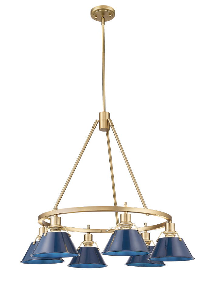 Bring industrial elegance into your home with the Yep by Golden Lighting Orwell 6-light Chandelier. Featuring a metal shade and a Brushed Champagne Brass frame, it creates a welcoming atmosphere. The navy blue metal shade offers a bold and sophisticated pop of color, beautifully reflecting its surroundings, reminiscent of timeless nautical style. The finish delivers understated luxury with its soft satin sheen, adding a touch of contemporary style to any interior. Perfect for diverse settings, this chandelier is dry location rated for indoor spaces like bedrooms and living rooms. It is also sloped-ceiling compatible with adjustable height options ranging from 21.25" to 63.25". The overall dimensions are 29"W x 20.38"H x 29"D and requires 6 E26 medium base bulbs (not included), max wattage 60 per bulb. Transform your space into a stylish haven with this versatile fixture, manufactured with high-quality craftsmanship.