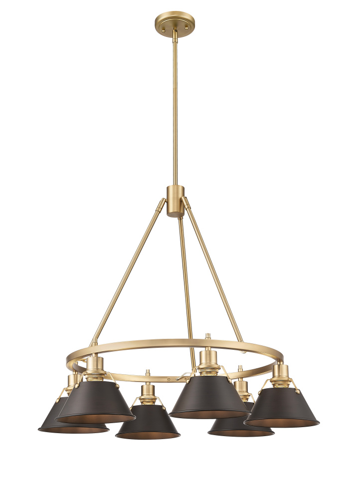 Bring industrial elegance into your home with the Yep by Golden Lighting Orwell 6-light Chandelier. Featuring a rubbed bronze shade and a brushed champagne brass frame, it creates a welcoming atmosphere. The rubbed bronze shade provides a warm, inviting glow that enhances your space while contributing a classic touch to your décor. The brushed champagne brass finish exudes modern sophistication, blending the warmth of brass and softness of silver, perfect for adding understated luxury to your interior design. Ideal for dry locations such as bedrooms, living rooms, and hallways, this chandelier is sloped-ceiling compatible and features adjustable height that ranges from 21.25" to 63.25", making it versatile for various spaces. Overall Dimensions: 29"W x 20.38"H x 29"D. Requires 6 E26 Medium base bulbs (not included), max wattage 60 per bulb. Transform your home with this captivating piece that seamlessly blends functionality and style for an inviting ambiance.