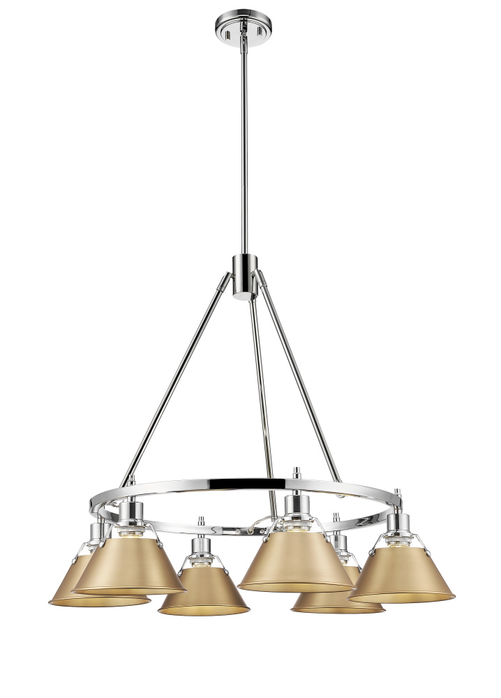 Bring contemporary industrial elegance into your home with the Yep by Golden Lighting Orwell 6-light Chandelier. Featuring a metal shade and a chrome frame, this chandelier creates a warm and inviting atmosphere. The metal shade, designed in Brushed Champagne Brass, showcases a soft satin sheen with a refined brushed texture that beautifully interacts with light. The versatile chrome finish enhances the overall aesthetic appeal, making it suitable for a variety of decor styles. This chandelier is perfect for dry locations and ideal for indoor spaces such as bedrooms, living rooms, and hallways. Easy to install, it features sloped-ceiling compatibility and an adjustable height (Min: 21.25"- Max: 63.25"). With dimensions of 29"W x 20.38"H x 29"D, it requires 6 E26 Medium base bulbs (not included). Enhance your home ambiance with this striking chandelier that exudes luxury and style.