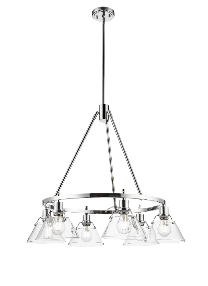 Bring industrial elegance into your home with the Yep by Golden Lighting Orwell 6-light Chandelier. Featuring a glass shade and a Chrome frame, it creates a welcoming atmosphere. The clear glass shade allows brilliant, unobstructed light to shine through while complementing the fixture's sleek design. With a polished finish, the clear glass enhances the industrial aesthetic while allowing the beauty of the bulbs to take center stage. Brilliant and timeless, the Chrome finish offers a crisp, clean look that elevates any space. Its highly reflective surface provides a stunning gleam that is both sleek and sophisticated. Make a grand impression in dining rooms and foyers or elevate bedrooms and living spaces with a touch of classic elegance. It is dry location rated, making it ideal for indoor spaces not subject to moisture. The fixture is also sloped-ceiling compatible and adjustable in height, ranging from 21.25" to 63.25". Overall Dimensions: 29"W x 20.38"H x 29"D. Requires 6 E26 Medium base bulbs (not included), with a maximum wattage of 60 per bulb. Enhance your home with a quality chandelier that merges style and functionality.