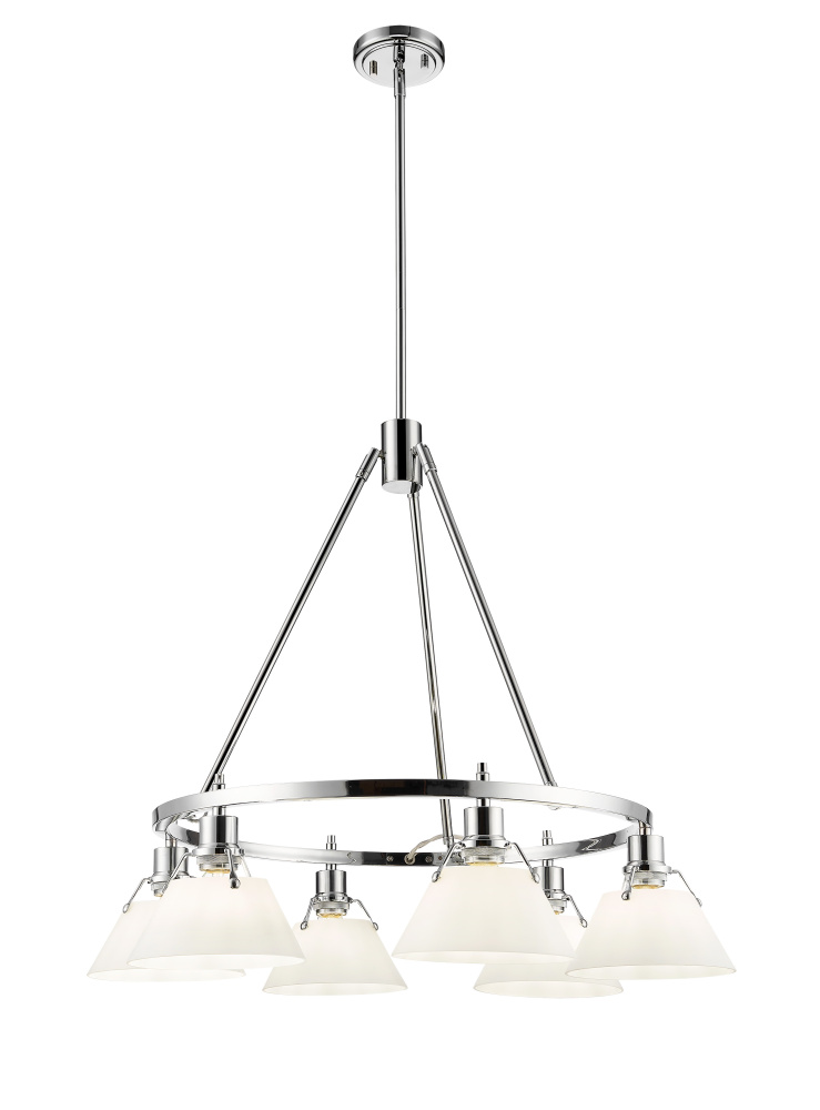 Bring industrial elegance into your home with the Yep by Golden Lighting Orwell 6-light Chandelier. Featuring an opal glass shade and a chrome frame, it creates a welcoming atmosphere. The opal glass shade is designed to diffuse light evenly, providing a soft, glare-free glow that enhances your space. With a smooth, satin-matte finish, it adds a timeless touch to your interiors. The brilliant chrome finish offers a clean, high-shine look that is incredibly versatile, integrating seamlessly into a variety of decor styles from ultra-modern to classic traditional. Ideal for dining rooms and foyers, this chandelier is dry location rated for indoor spaces and is easily installed on angled ceilings with adjustable height settings ranging from 21.25" to 63.25". Overall dimensions measure 29"W x 20.38"H x 29"D, and it requires 6 E26 medium base bulbs (not included) with a maximum wattage of 60 per bulb. Elevate your decor with this sophisticated lighting fixture that showcases both style and quality.