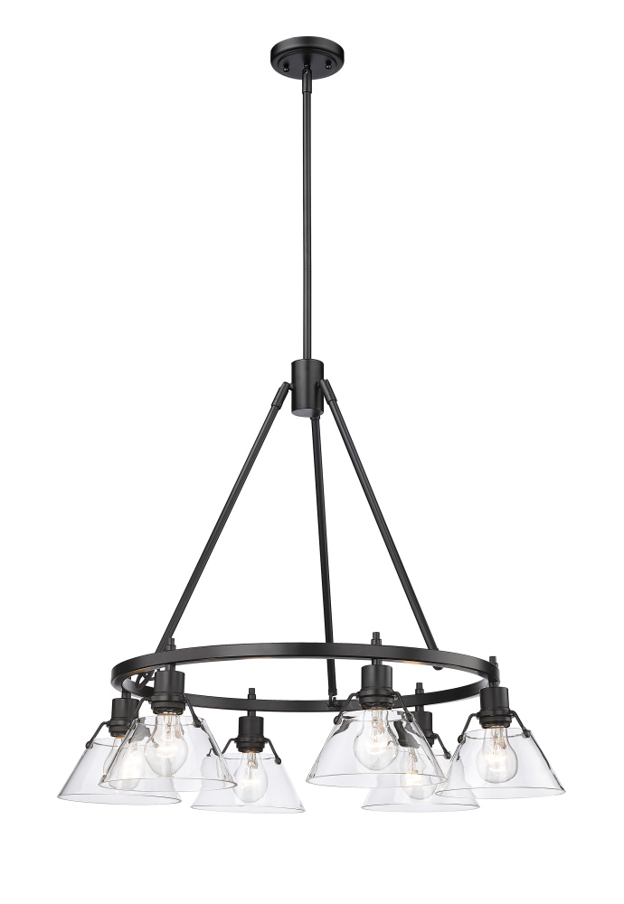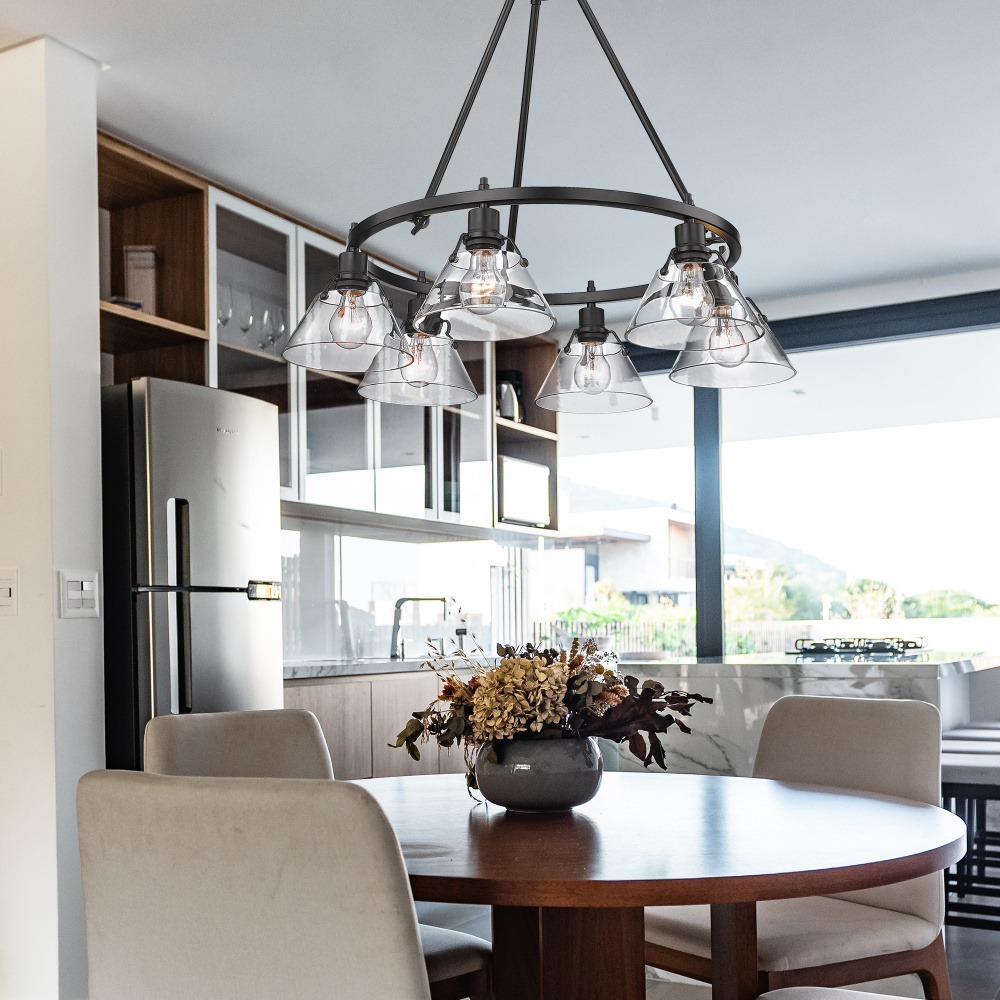 Bring industrial chic into your home with the Yep by Golden Lighting Orwell 6-light Chandelier. Featuring a clear glass shade and a matte black frame, it creates an inviting and stylish atmosphere. The clear glass shade allows brilliant, unobstructed light to shine through, highlighting the beauty of the bulbs and the unique design of the fixture. This minimalist approach complements a variety of styles, from modern to contemporary, making it a versatile addition to any space. Ideal for dry locations, this chandelier is perfect for indoor settings such as dining rooms, living rooms, and foyers. With sloped-ceiling compatibility and adjustable height, installation is straightforward and customizable to your liking. Overall Dimensions: 29"W x 20.38"H x 29"D. Requires six E26 Medium base bulbs (not included) with a maximum wattage of 60 per bulb. Enhance your living space with this quality chandelier that combines functionality and stunning aesthetics.