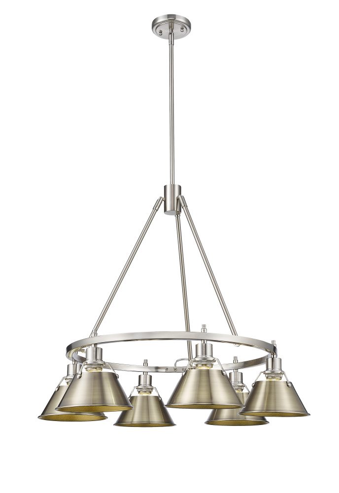 Bring industrial elegance into your home with the Yep by Golden Lighting Orwell 6-light Chandelier. Featuring a metal shade and a pewter frame, it creates a welcoming atmosphere. This chandelier showcases an Aged Brass electroplated finish that features a warm, antiqued gold base with darker undertones. This surface has a low-luster satin sheen that adds visual depth while beautifully catching and diffusing light, reminiscent of classic hardware. With its exquisite Pewter finish, this chandelier offers a soft and classic alternative to brighter silver tones, providing both sophistication and charm. Ideal for dining rooms and foyers, it’s also perfect for bedrooms and living spaces that crave a touch of vintage elegance. Rated for dry locations, installation is a breeze with its adjustable height feature that accommodates sloped ceilings and a minimum height of 21.25" up to a maximum of 63.25". The overall dimensions are 29"W x 20.38"H x 29"D and it requires 6 E26 Medium base bulbs (not included) with a maximum wattage of 60 per bulb. Enhance your space with this stunning fixture that brings a blend of tradition and modernity, perfect for any setting.