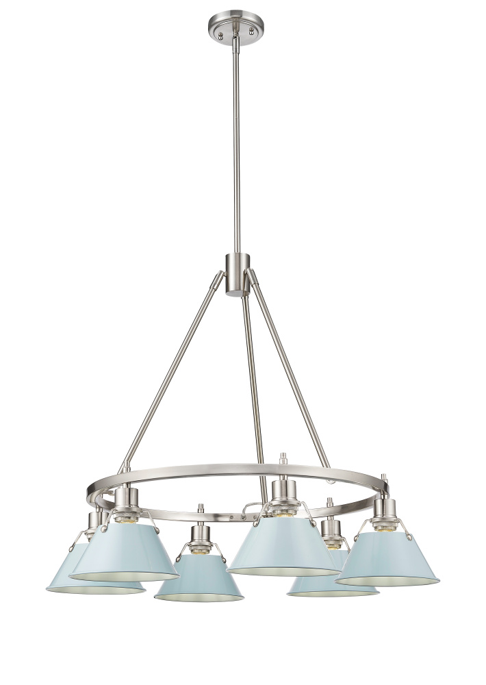 Bring industrial elegance into your home with the Yep by Golden Lighting Orwell 6-light Chandelier. Featuring a dusky blue metal shade and a pewter frame, it creates a welcoming atmosphere. The dusky blue metal shade adds a calming touch of color and exhibits a smooth surface with a high-gloss sheen, while allowing light to escape upwards for an inviting glow, enhancing any space with its serene appeal. Ideal for indoor spaces not subject to moisture, such as bedrooms, living rooms, and hallways, this fixture is sloped-ceiling compatible and has an adjustable height ranging from 21.25" to 63.25". With overall dimensions of 29"W x 20.38"H x 29"D and requiring six E26 Medium base bulbs (not included, max 60 wattage per bulb), it promises ample illumination for your gatherings. Elevate your space with the quality and style of Yep by Golden Lighting.