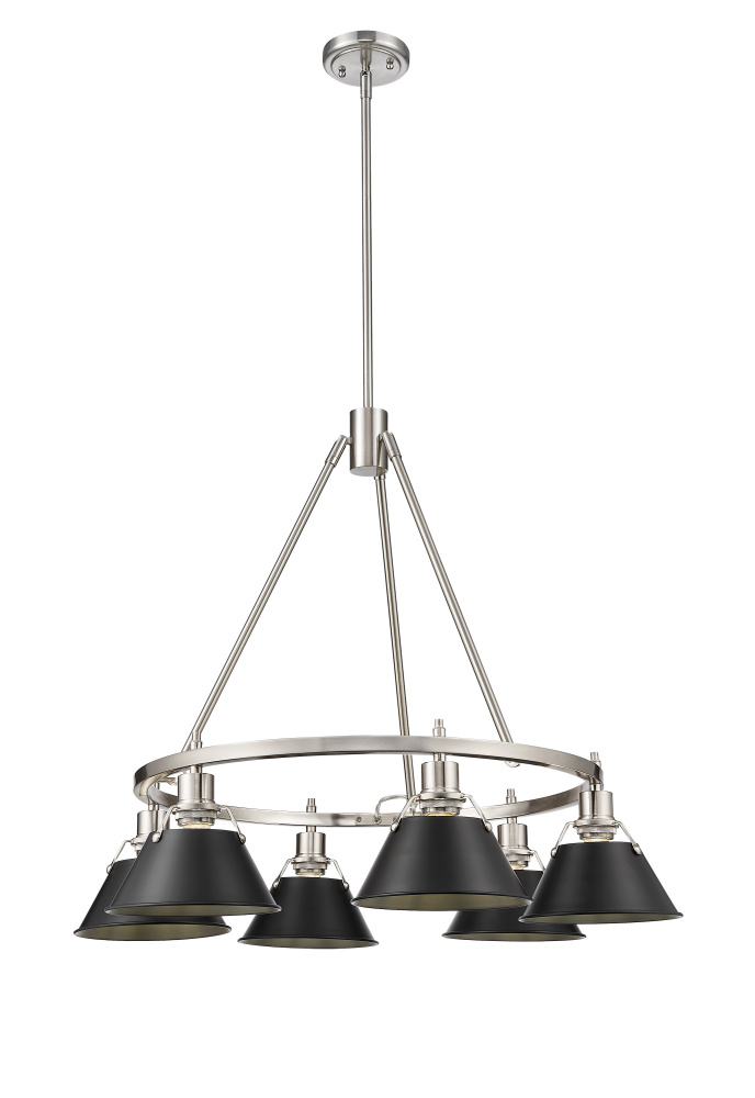 Bring industrial elegance into your home with the Yep by Golden Lighting Orwell 6-light Chandelier. Featuring a metal shade and a Pewter frame, it creates a welcoming atmosphere. The Matte Black metal shade offers a deep and sophisticated finish that absorbs light, enhancing the modern and sleek impression, perfect for a clean aesthetic. Crafted from a durable Pewter finish, this chandelier blends classic and contemporary styles, providing an elegant glow that transforms your space. Perfect for dining rooms, hallways, and living areas, this Dry Location Rated fixture is designed for indoor settings away from moisture. Its sloped-ceiling compatibility and adjustable height (21.25" to 63.25") make installation effortless. Overall Dimensions: 29"W x 20.38"H x 29"D. Requires 6 E26 Medium base bulbs (not included), with a maximum of 60 watts per bulb. Enhance your home’s atmosphere with this stunning chandelier that harmonizes quality design with timeless elegance.