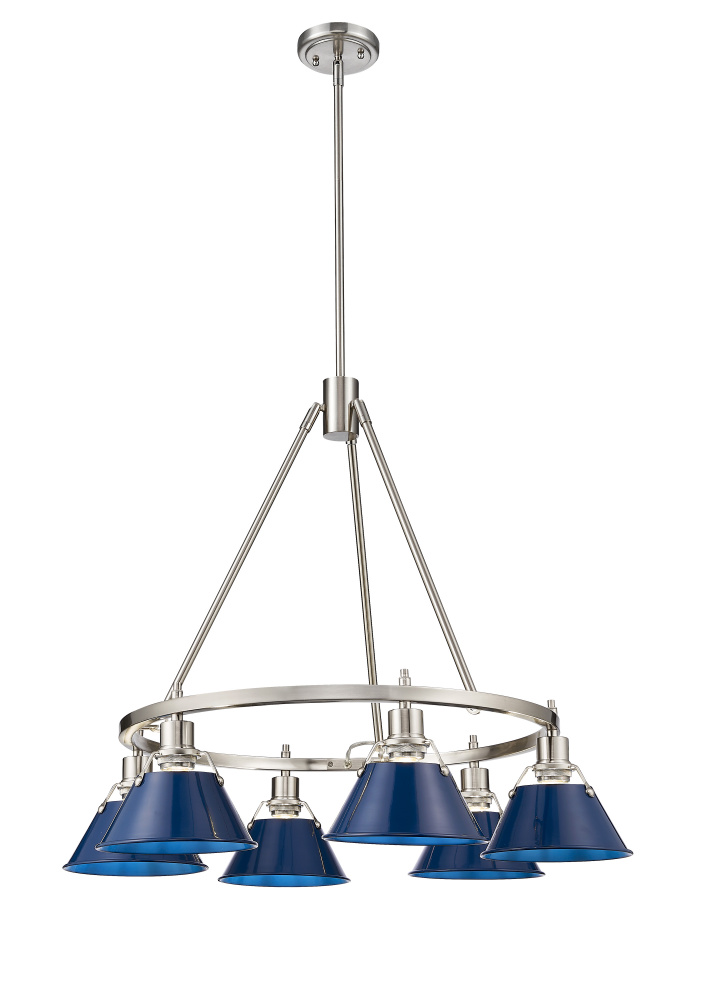 Bring industrial elegance into your home with the Yep by Golden Lighting Orwell 6-light Chandelier. Featuring a metal shade and a pewter frame, it creates a welcoming atmosphere. The metal shade presents a Navy Blue finish, showcasing a rich, deep hue with a high-gloss, liquid-like sheen that beautifully reflects light. Our pewter finish offers a soft and classic alternative to brighter silver tones. With its medium-grey hue and subtle warmth, this finish brings an understated charm to both classic and contemporary interiors. Ideal for indoor spaces not subject to moisture, such as bedrooms, living rooms, and hallways, this chandelier is also sloped-ceiling compatible with an adjustable height ranging from 21.25" to 63.25". Overall dimensions are 29"W x 20.38"H x 29"D, requiring 6 E26 Medium base bulbs (not included) with a maximum wattage of 60 per bulb. Enhance your space with this timeless piece that delivers both style and quality.