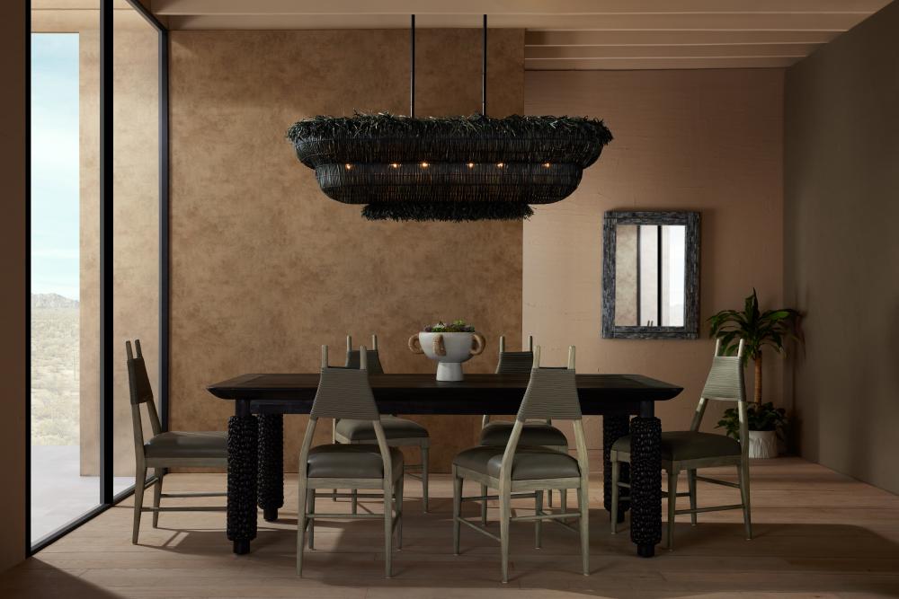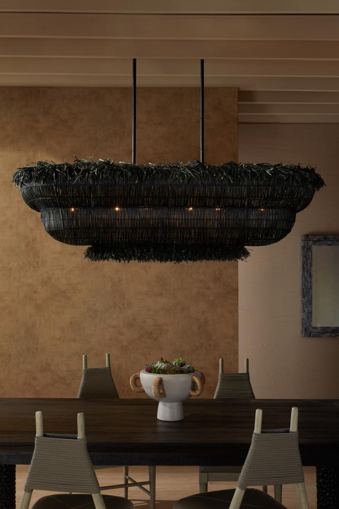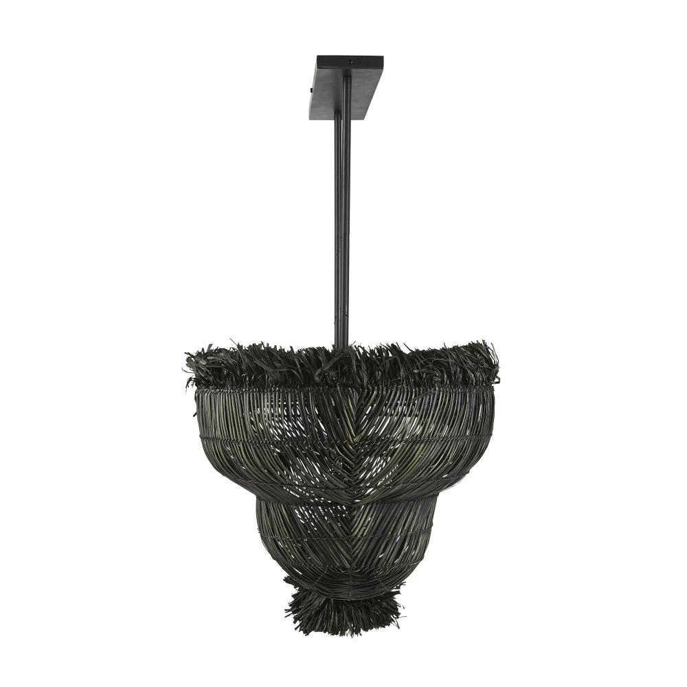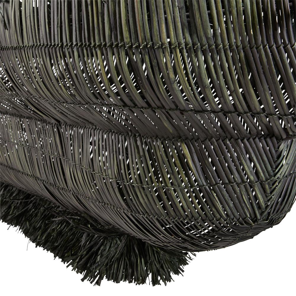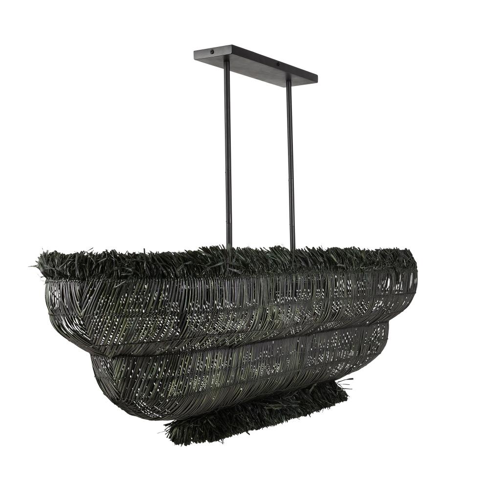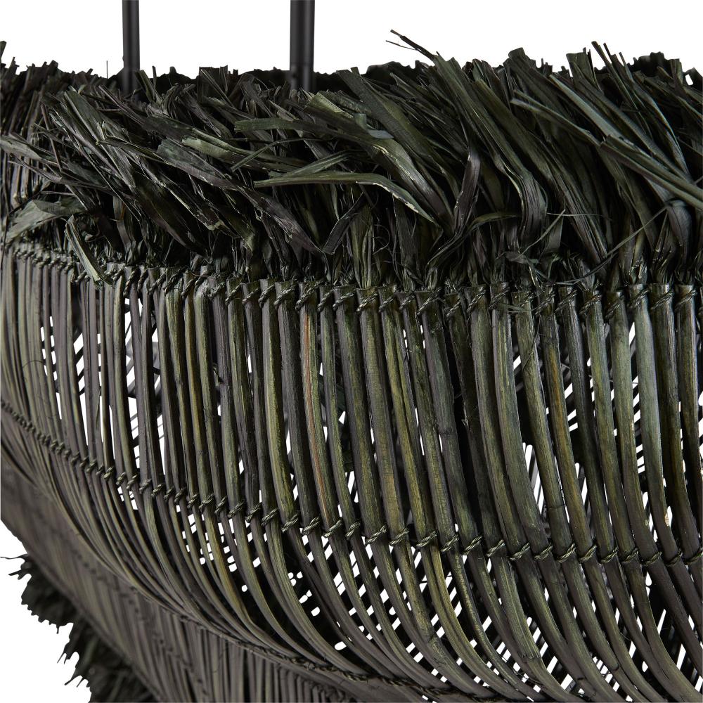 The natural warmth of raffia gets an airy update in the woven Yessika. Thatched, stained dark gray and fringed with a flourish, this texturally delightful style is suspended from a pair of slim matte iron pipes. Reminiscent of the shape of a boat hull, this unique fixture lends a touch of the tropics over any space. Finish will vary.
