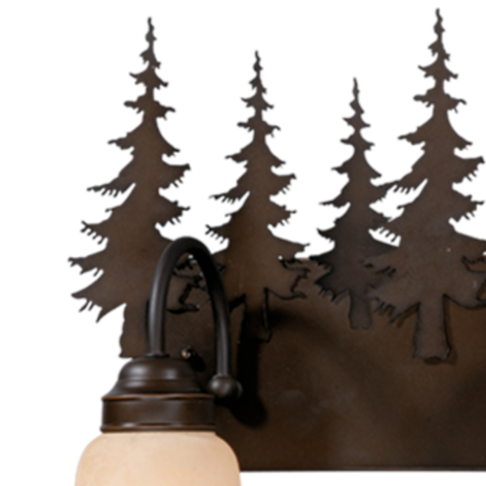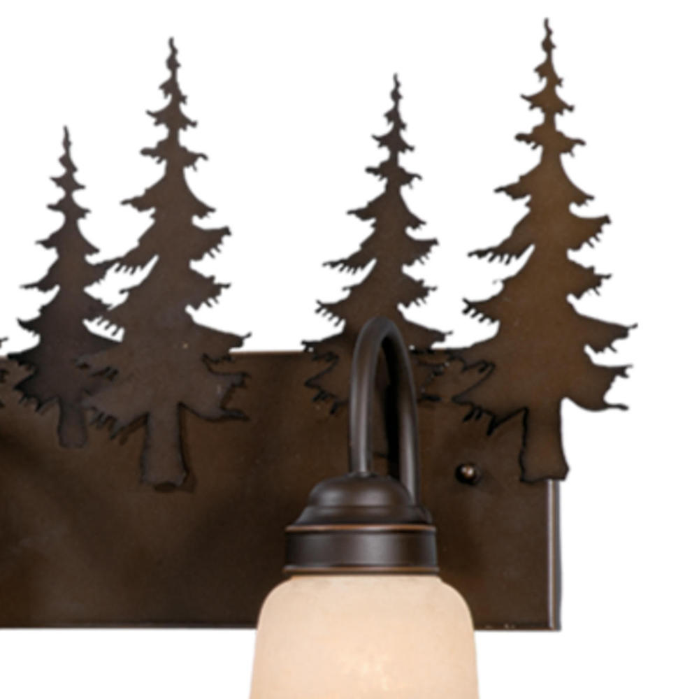 Evoking the spirit of the wilderness, this rustic themed light is clad in a burnished bronze finish and features silhouetted tree imagery atop glowing amber flake glass. It is a great choice for a vacation lodge, cabin or suburban home and will complement a variety of home styles: anywhere you want to bring an element of nature. This bathroom light is perfect over small vanities or as a pair over double sinks.