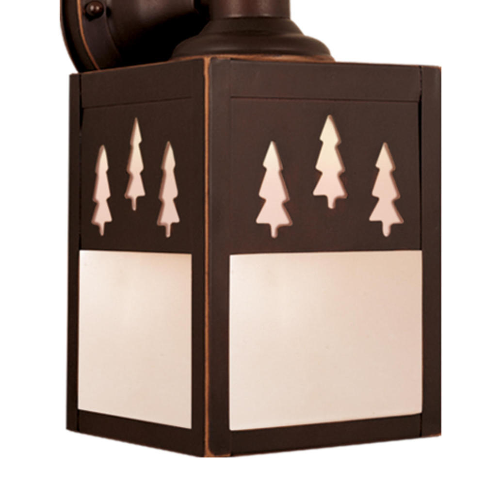 Evoking the spirit of the wilderness, this rustic themed light is clad in a burnished bronze finish and features silhouetted tree imagery atop glowing white tiffany style glass. It is a great choice for a vacation lodge, cabin or suburban home and will complement a variety of home styles: anywhere you want to bring an element of nature. This outdoor wall light is ideal for your porch, entryway, garage, or any other area of your home.