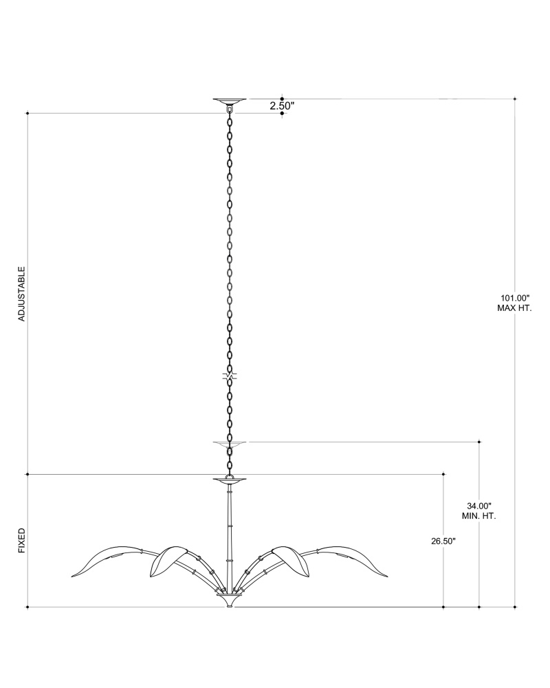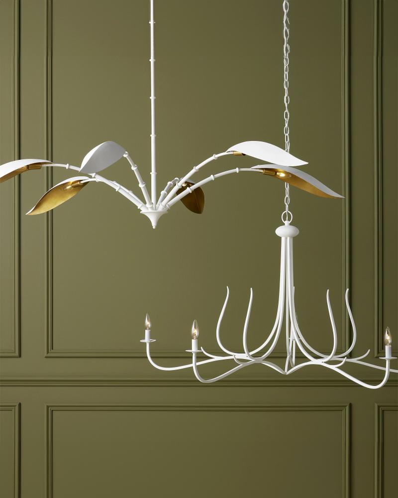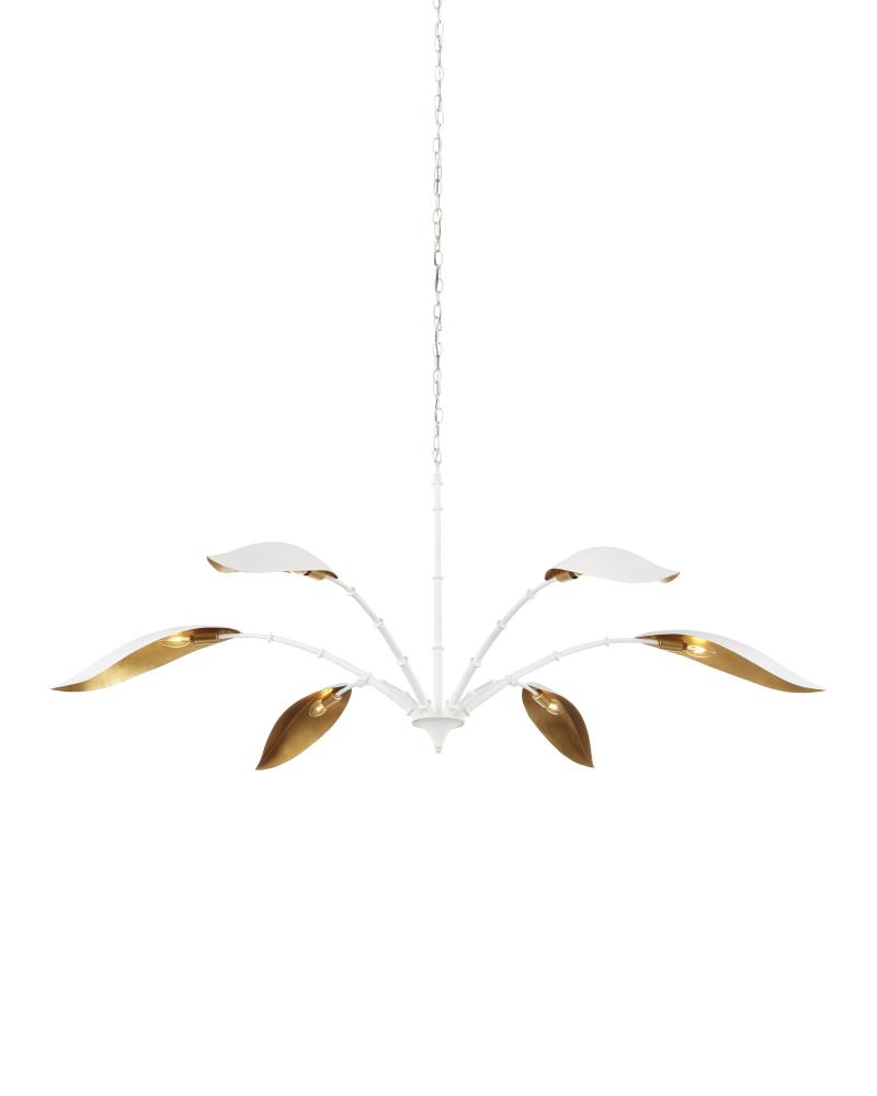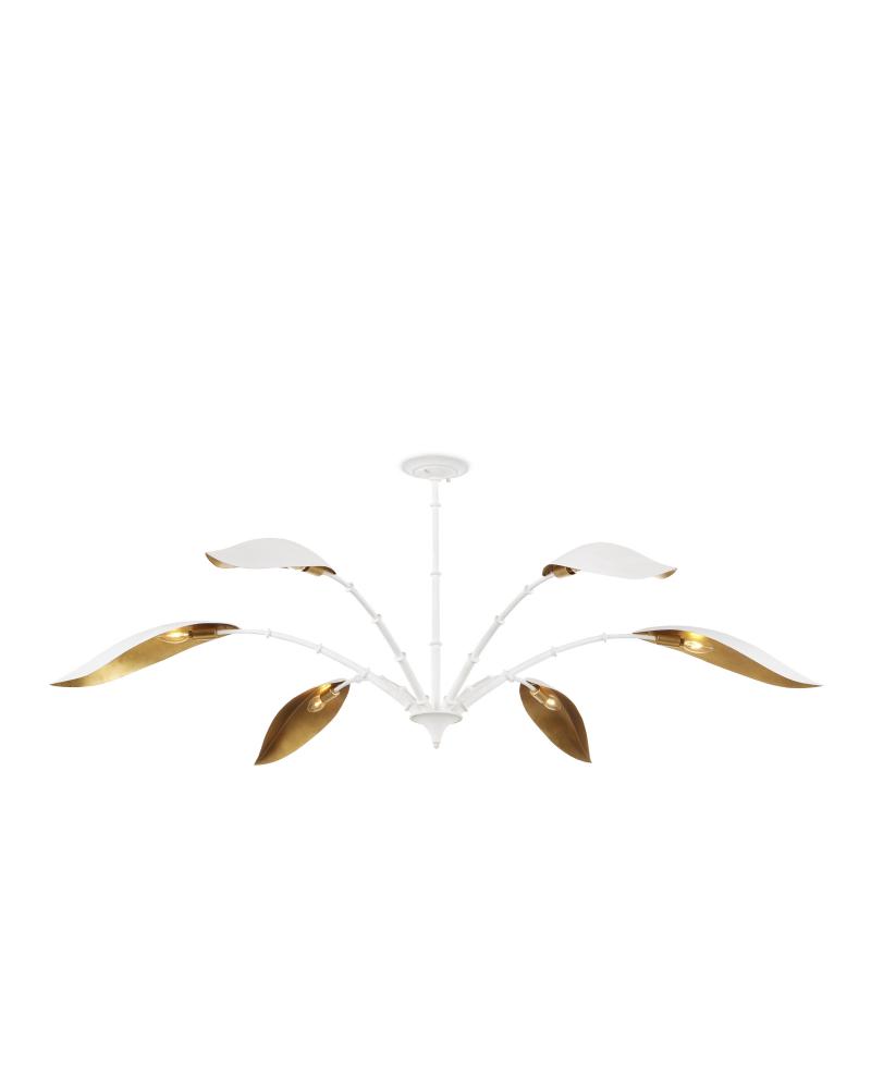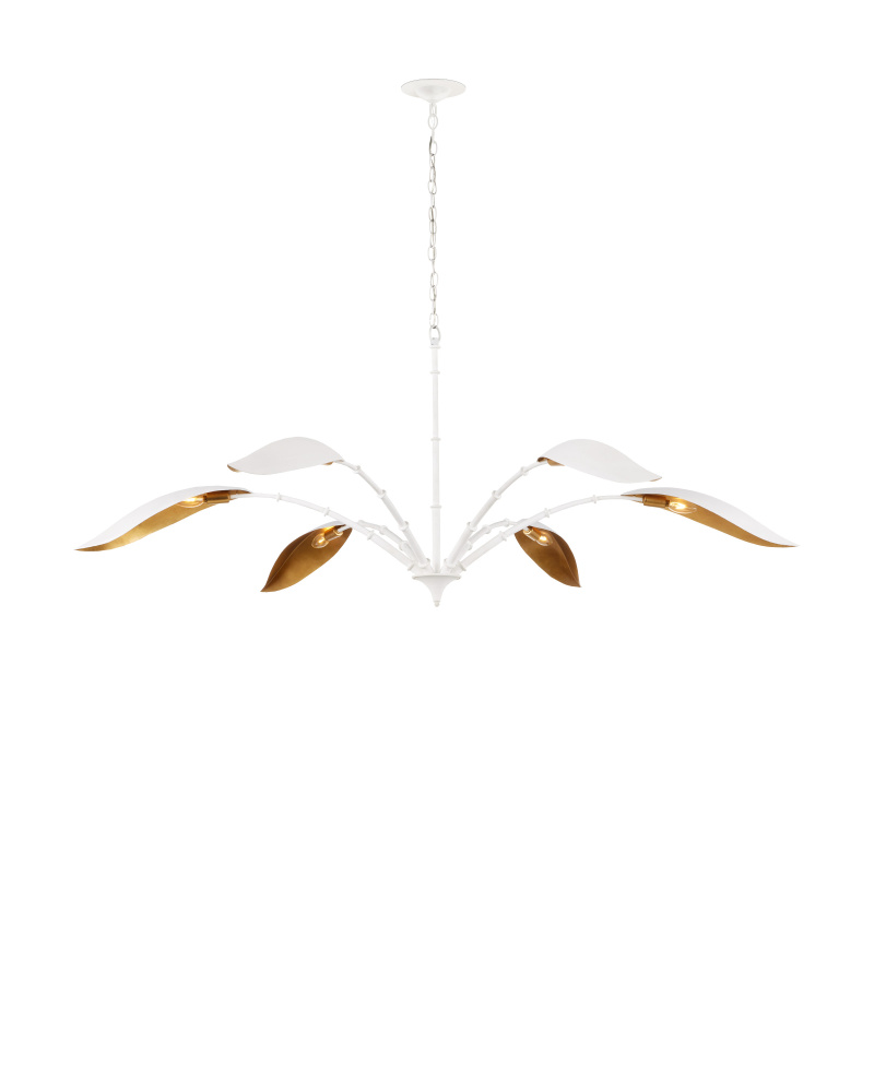 As if it has sprouted three pairs of lily petals that arc delicately away from each other, the Yuriko Chandelier is a crisp white creation until the interiors of those petals are glimpsed, as they are finished in a contemporary gold leaf that contrasts the gesso white beautifully. The brilliance of this design doesn't stop there: it continues in the pare-down quality of the stems from which the shades extend, which grow thinner as they move toward the petals; the circular details on these, which create an elemental knottiness like that of bamboo; and the elegant shape of the small cup from which they branch out. Adjustable from 33.5" to 101" with use of included chain/rod kit/cable. If your space calls for a longer drop, additional chain/rods/cable is available for purchase.