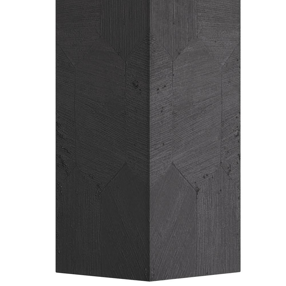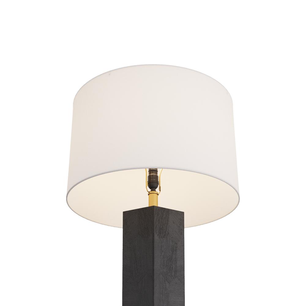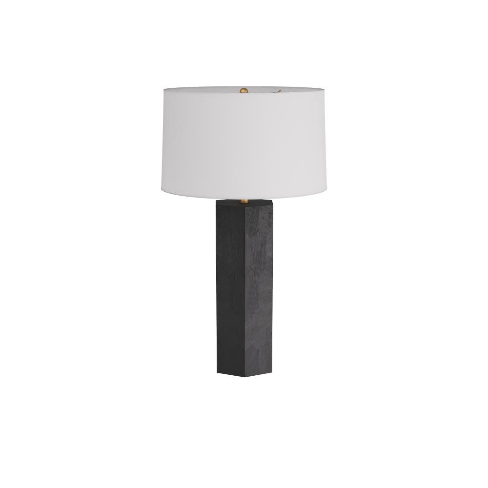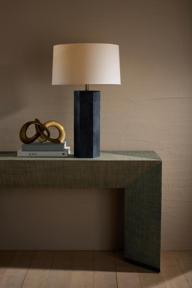 Crafted of ebony corn husk, this hexagonal Zaya delivers clean lines and elemental materials to stunning effect. Adorned with antique brass finished accents, its textural base is completed with a matching finial and a drum shade of off-white linen lined in cotton. Clear silver cord and three-way rotary switch.