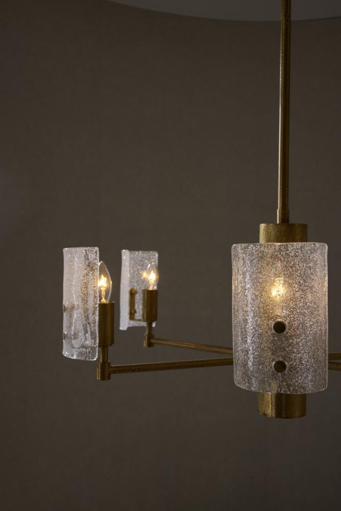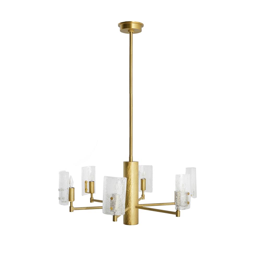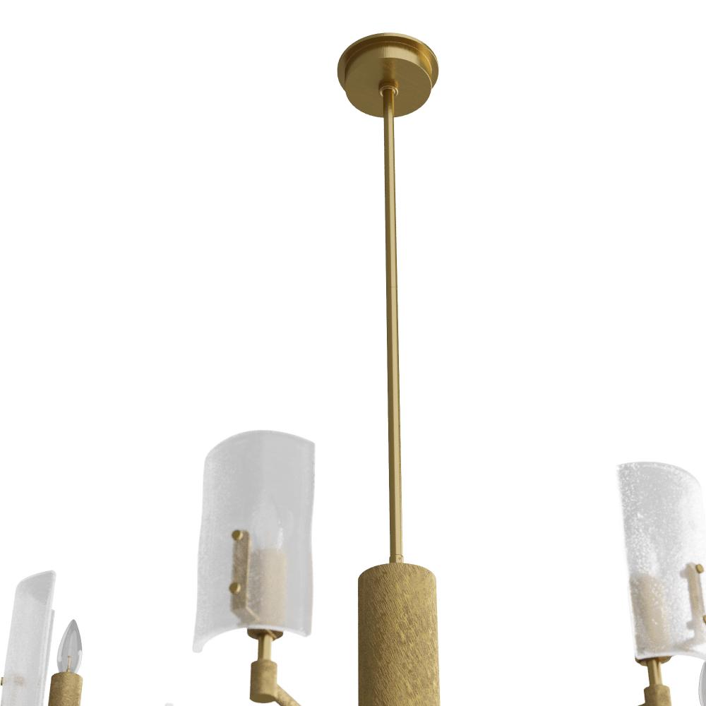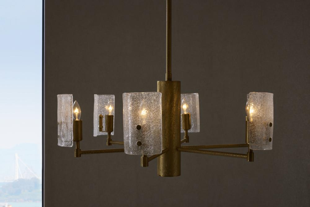 Six half-cylinder shades, crafted with clear seedy slump glass, are punctuated with decorative screws of antique brass. Suspended from an antique brass body with an intriguing mix of smooth and chattered texture, this luxe fixture lends a flattering, diffused effect to any room. Damp-rated, although limited covered outdoor conditions may affect finish. Finish will vary.