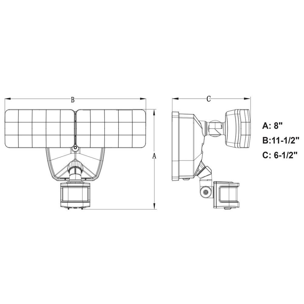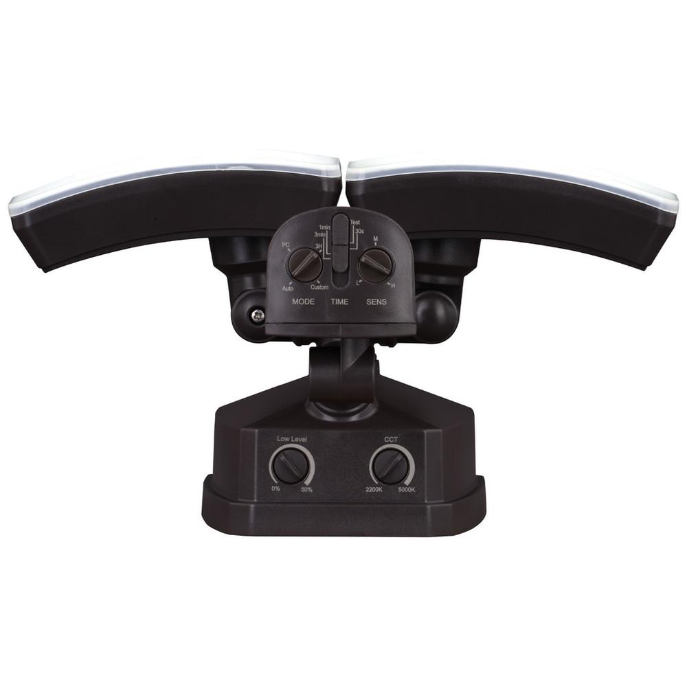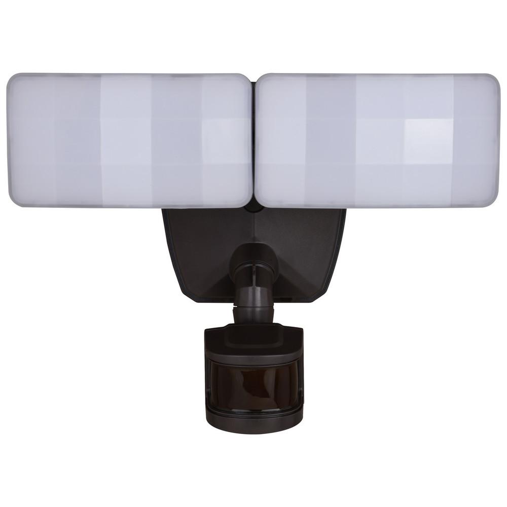 The bronze 2-light Zeta LED motion sensor security flood light provides adjustable low level brightness and color temperature while also delivering brilliant 5000K high level illumination when motion is detected. The modern light heads are fully adjustable and deliver 2,400 lumens to keep your home's exterior brighter at dusk, dimmer at night, and instantly bright when motion is detected. This dualux security light expands the functionality, safety, and security of your home's outdoor spaces with bright, reliable light when and where it is needed.