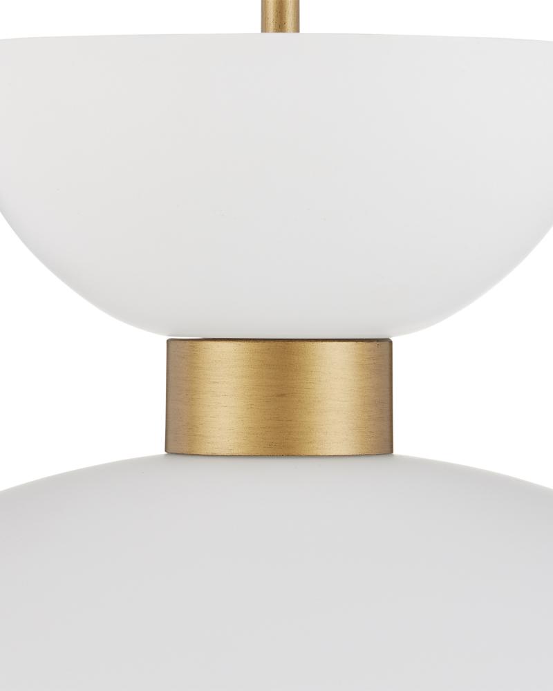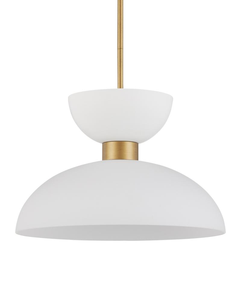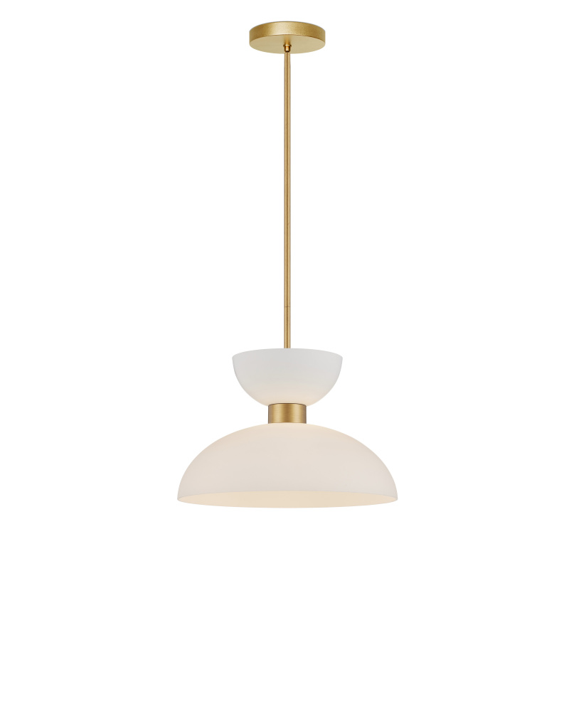 When the lights are switched off, it can be hard to tell that the top and bottom cup-shaped shades of the Zevio White Pendant are made of different materials. The fixture features a frosted glass shade on the bottom and a steel shade in a white finish on the top. The circlet that clinches these as they transition, along with the clean-lined stem from which the pendant hangs, are contrasting elements made of brass-toned metal. Adjustable from 16.5" to 58" with use of included chain/rod kit/cable. If your space calls for a longer drop, additional chain/rods/cable is available for purchase.
