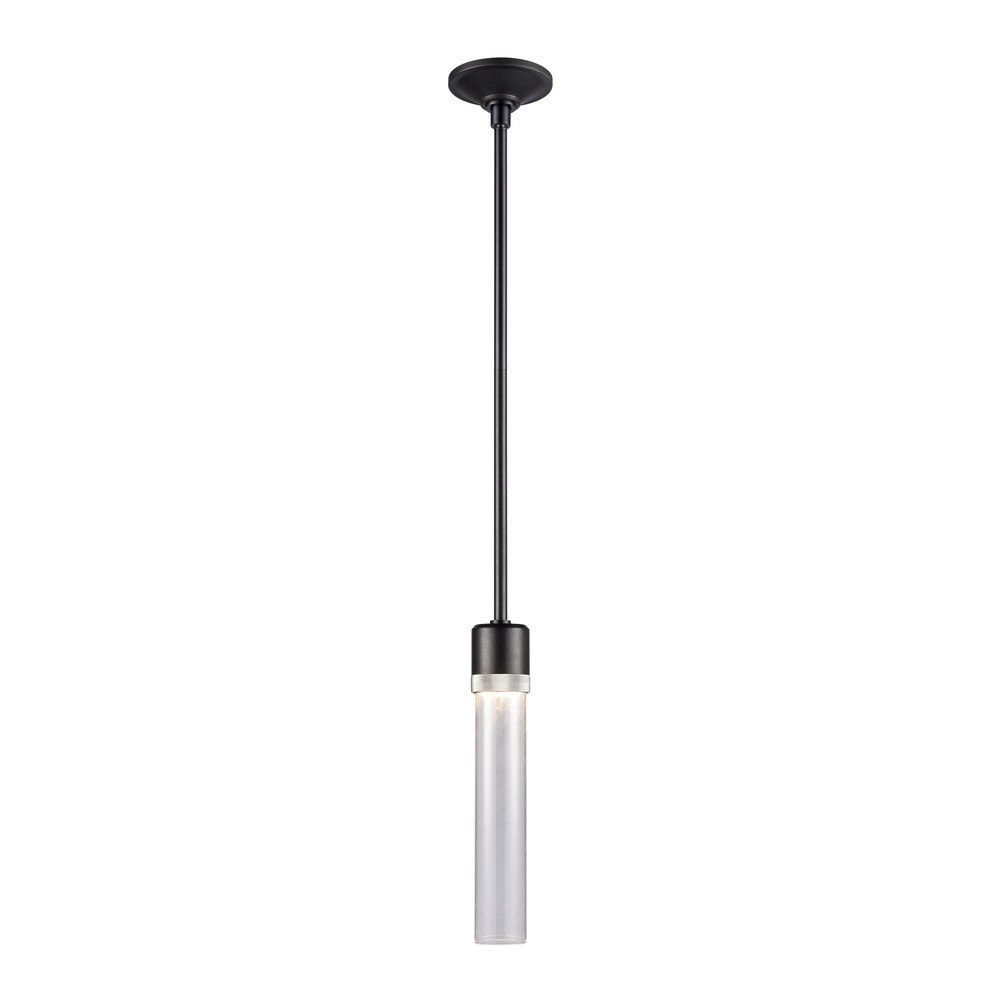 3" High End Vertical Cylindrical Pendant Light, 12" Clear Transparent Glass Shade and Our Sleek Satin Brushed Black Finish with Detailed Polished Nickel Diamond Knurled Metal Band. Integrated Replaceable LED with 3CCT 3000K, 3500K and 4000K.