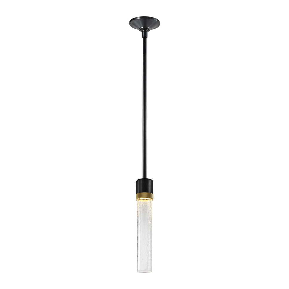 3" High End Vertical Cylindrical Pendant Light, 12" Eye Catching Crackled Glass Shade and Our Sleek Satin Brushed Black Finish with Detailed Aged Brass Diamond Knurled Metal Band. Integrated Replaceable LED with 3CCT 3000K, 3500K and 4000K.
