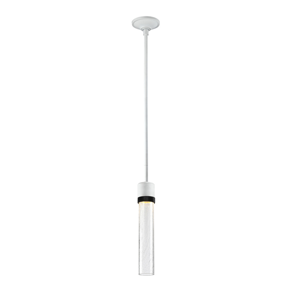 3" High End Vertical Cylindrical Pendant Light, 12" Eye Catching Crackled Glass Shade and Our Chic Matte White Finish with Detailed Satin Brushed Black Diamond Knurled Metal Band. Integrated Replaceable LED with 3CCT 3000K, 3500K and 4000K.
