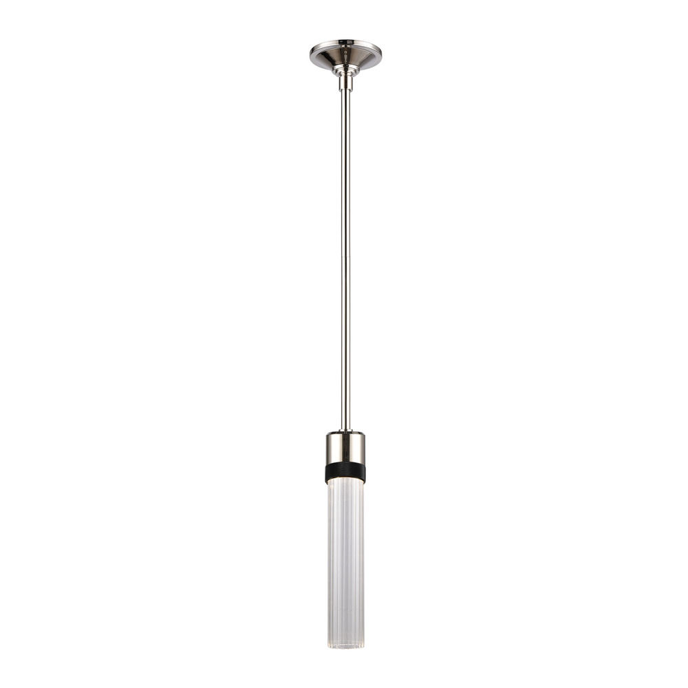 3" High End Vertical Cylindrical Pendant Light, 12" Fluted Glass Shade and Our Luxurious Polished Nickel Finish with Detailed Satin Brushed Black Diamond Knurled Metal Band. Integrated Replaceable LED with 3CCT 3000K, 3500K and 4000K.