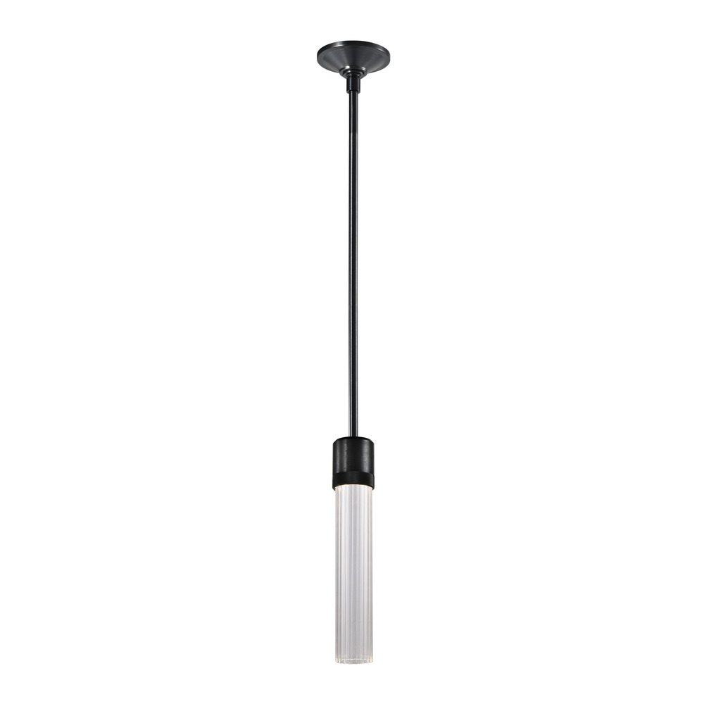 3" High End Vertical Cylindrical Pendant Light, 12" Fluted Glass Shade and Our Sleek Satin Brushed Black Finish with Detailed Diamond Knurled Metal Band. Integrated Replaceable LED with 3CCT 3000K, 3500K and 4000K.