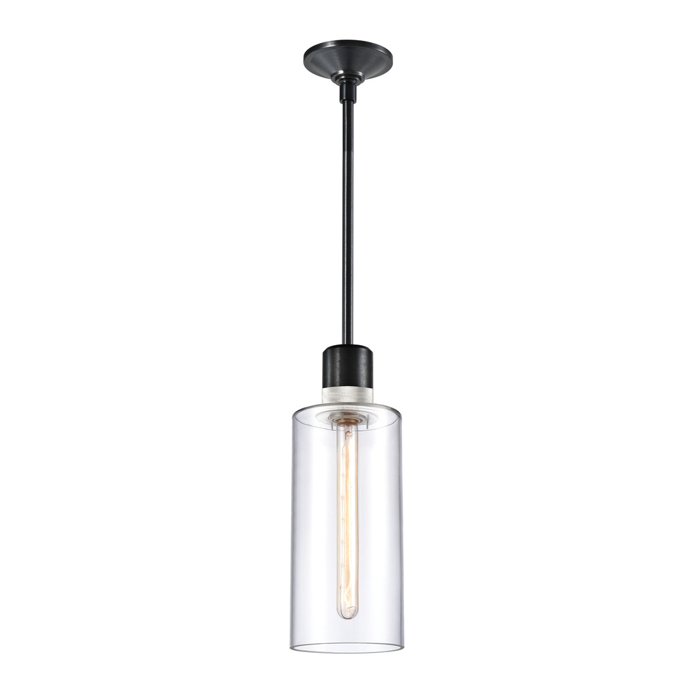 12" High End Clear Glass Drum Shade Pendant Light in Our Sleek Satin Brushed Black Finish with Detailed Polished Nickel Diamond Knurled Metal Band. E26 Medium Base Socket for 12" T10 LED Bulb Not Included.
