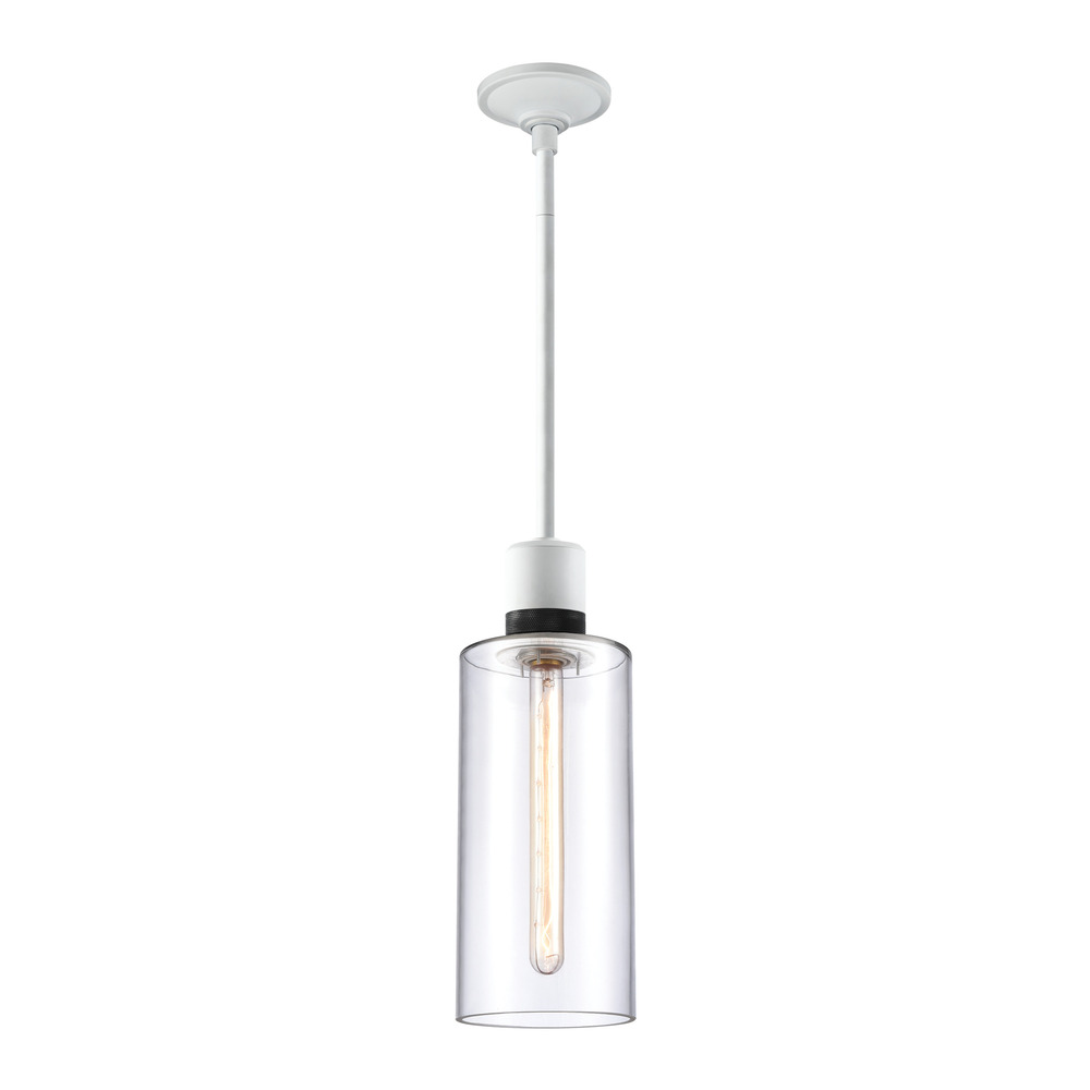 12" High End Clear Glass Drum Shade Pendant Light in Our Chic Matte White Finish with Detailed Satin Brushed Black Diamond Knurled Metal Band. E26 Medium Base Socket for 12" T10 LED Bulb Not Included.