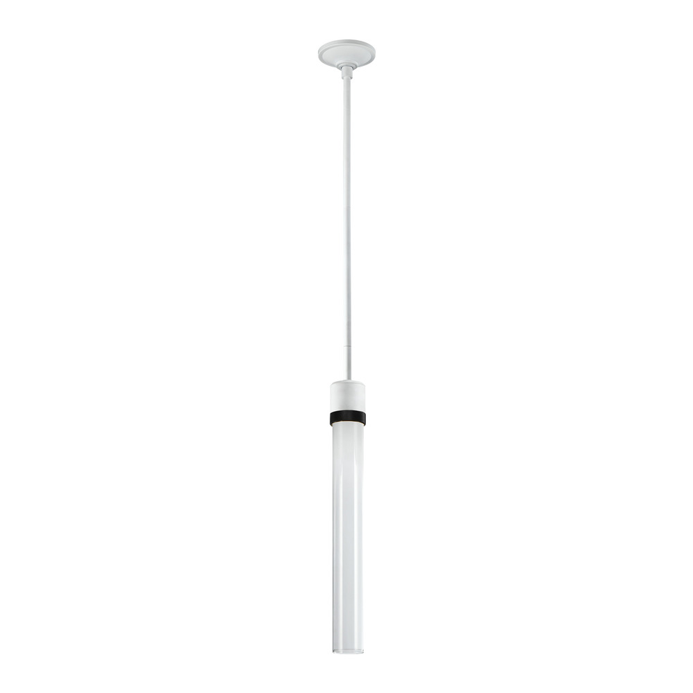 3" High End Vertical Cylindrical Pendant Light, 18" Clear Transparent Glass Shade and Our Chic Matte White Finish with Detailed Satin Brushed Black Diamond Knurled Metal Band. Integrated Replaceable LED with 3CCT 3000K, 3500K and 4000K.