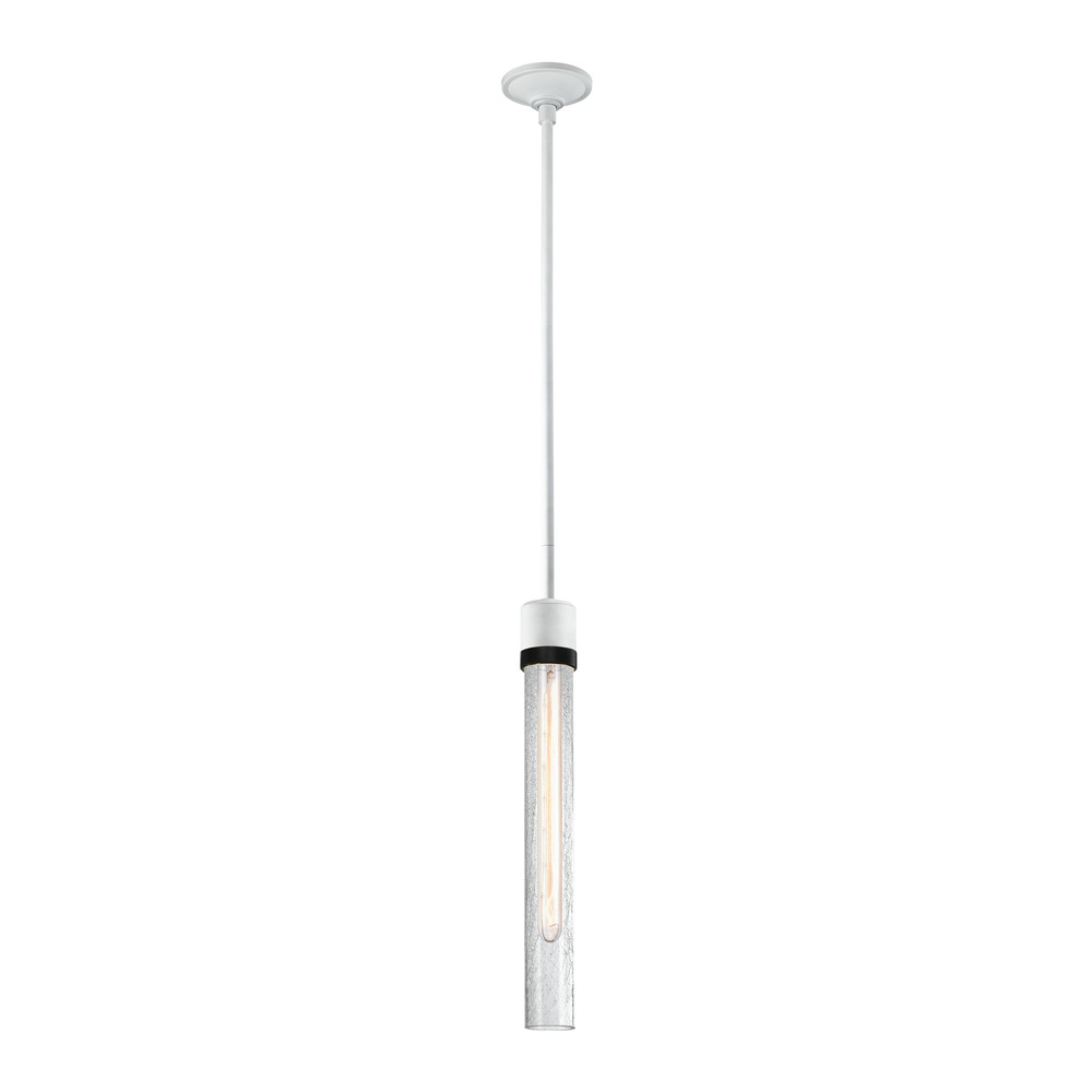 3" High End Vertical Cylindrical Pendant Light, 18" Eye Catching Crackled Glass and Our Chic Matte White Finish with Detailed Satin Brushed Black Diamond Knurled Metal Band. E26 Medium Base Socket for 12" T10 Filament LED Bulb Not Included.