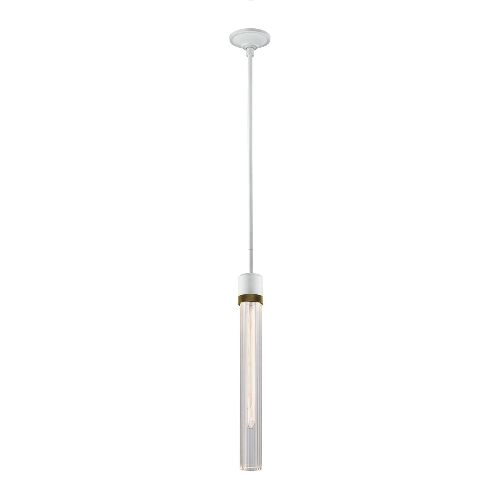 3" High End Vertical Cylindrical Pendant Light, 18" Fluted Glass Shade and Our Chic Matte White Finish with Detailed Aged Brass Diamond Knurled Metal Band. E26 Medium Base Socket for 12" T10 Filament LED Bulb Not Included.