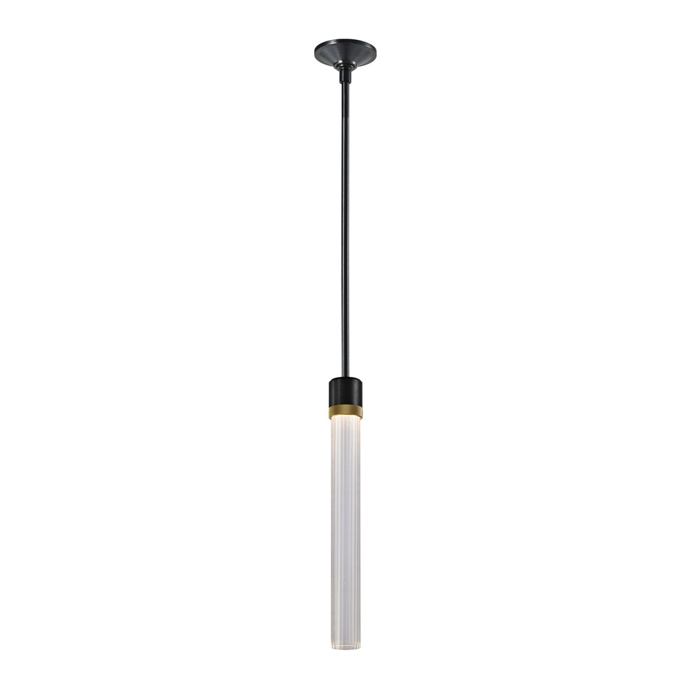 3" High End Vertical Cylindrical Pendant Light, 18" Fluted Glass Shade and Our Sleek Satin Brushed Black Finish with Detailed Aged Brass Diamond Knurled Metal Band. Integrated Replaceable LED with 3CCT 3000K, 3500K and 4000K.