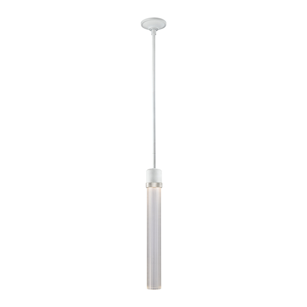 3" High End Vertical Cylindrical Pendant Light, 18" Fluted Glass Shade and Our Chic Matte White Finish with Detailed Polished Nickel Diamond Knurled Metal Band. Integrated Replaceable LED with 3CCT 3000K, 3500K and 4000K.