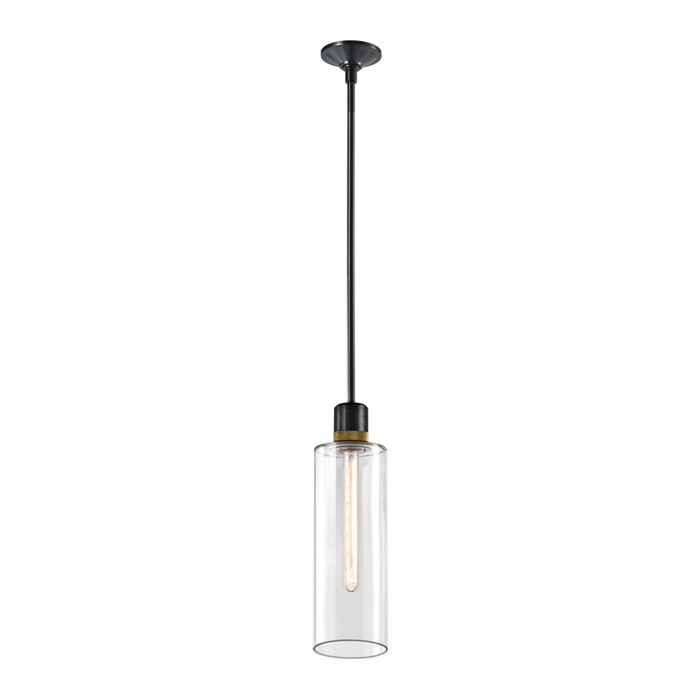 18" High End Clear Glass Drum Shade Pendant Light in Our Sleek Satin Brushed Black Finish with Detailed Aged Brass Diamond Knurled Metal Band. E26 Medium Base Socket for 12" T10 LED Bulb Not Included.