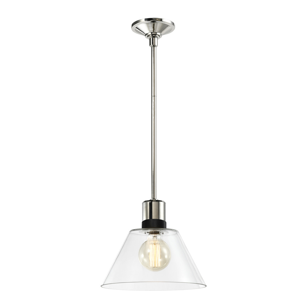 12" High End Clear Glass Cone Shade Pendant Light in Our Luxurious Polished Nickel Finish with Detailed Satin Brushed Black Diamond Knurled Metal Band. E26 Medium Base Socket for ST64 Edison LED Bulb Not Included.