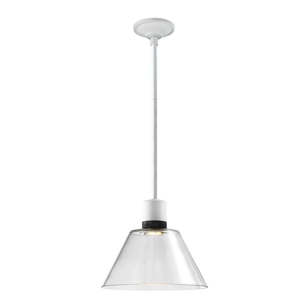 12" High End Clear Glass Cone Shade Pendant Light in Our Chic Matte White Finish with Detailed Satin Brushed Black Diamond Knurled Metal Band. Integrated Replaceable LED with 3CCT 3000K, 3500K and 4000K.