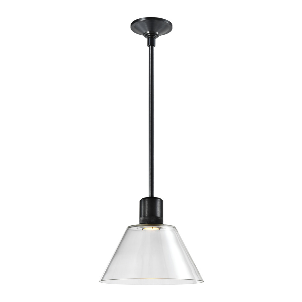 12" High End Clear Glass Cone Shade Pendant Light in Our Sleek Satin Brushed Black Finish with Detailed Diamond Knurled Metal Band. Integrated Replaceable LED with 3CCT 3000K, 3500K and 4000K.