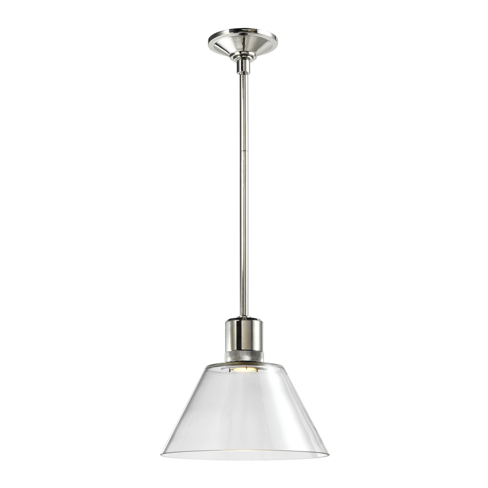 12" High End Clear Glass Cone Shade Pendant Light in Our Luxurious Polished Nickel Finish with Detailed Diamond Knurled Metal Band. Integrated Replaceable LED with 3CCT 3000K, 3500K and 4000K.